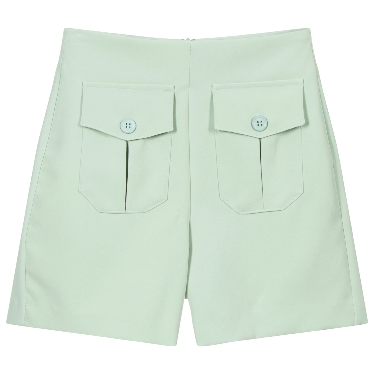 A lovely sage green pair of shorts for girls by Fun & Fun. Silky and lightweight, they are high-waisted and perfect for formal and special occasions. They have two front pockets with button fastenings and a concealed back zip.
