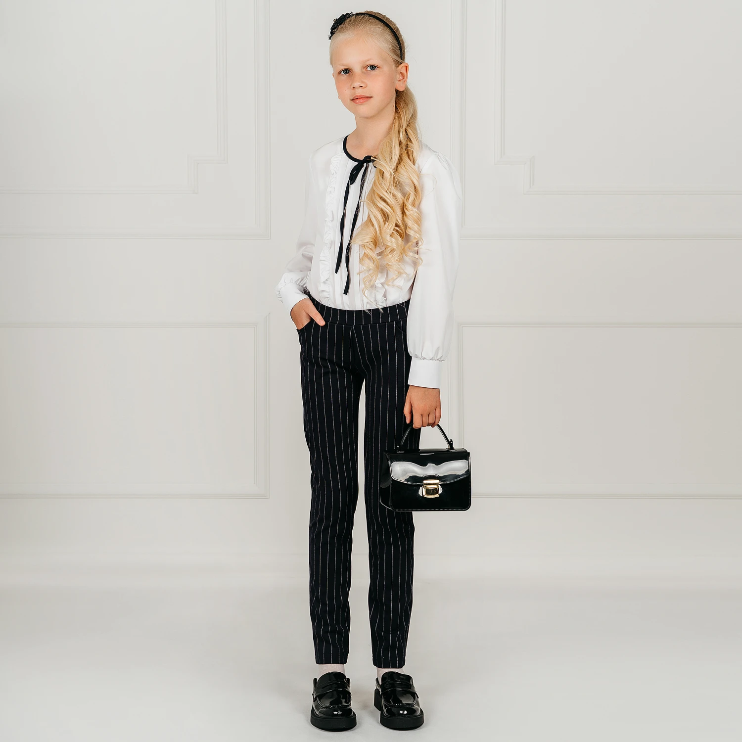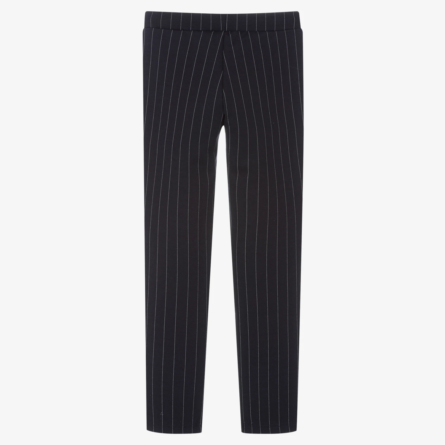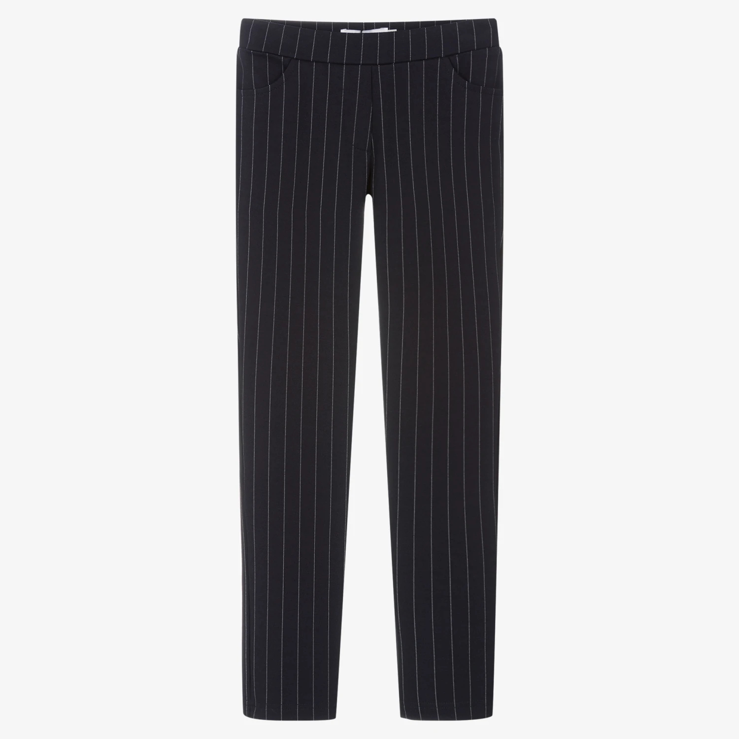 Comfortable pull-on trousers for girls by Giamo, in navy blue with a smart white pinstripe. Made in soft and stretchy Milano jersey, they have an elasticated waistband and useful front pockets.