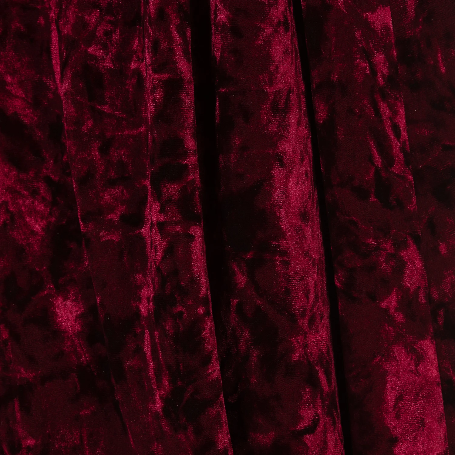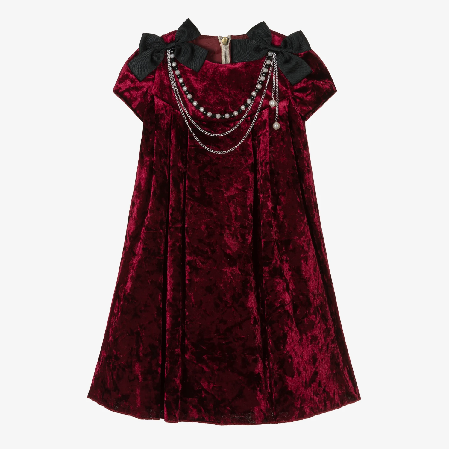 A beautiful special occasion dress for girls by Graci. Made in burgundy red crushed velvet, this lovely design has a removable beaded chain necklace that attaches to the shoulders with grosgrain ribbons bows. It is fully lined in satin with attached tulle trim for volume and a cotton lining for comfort.