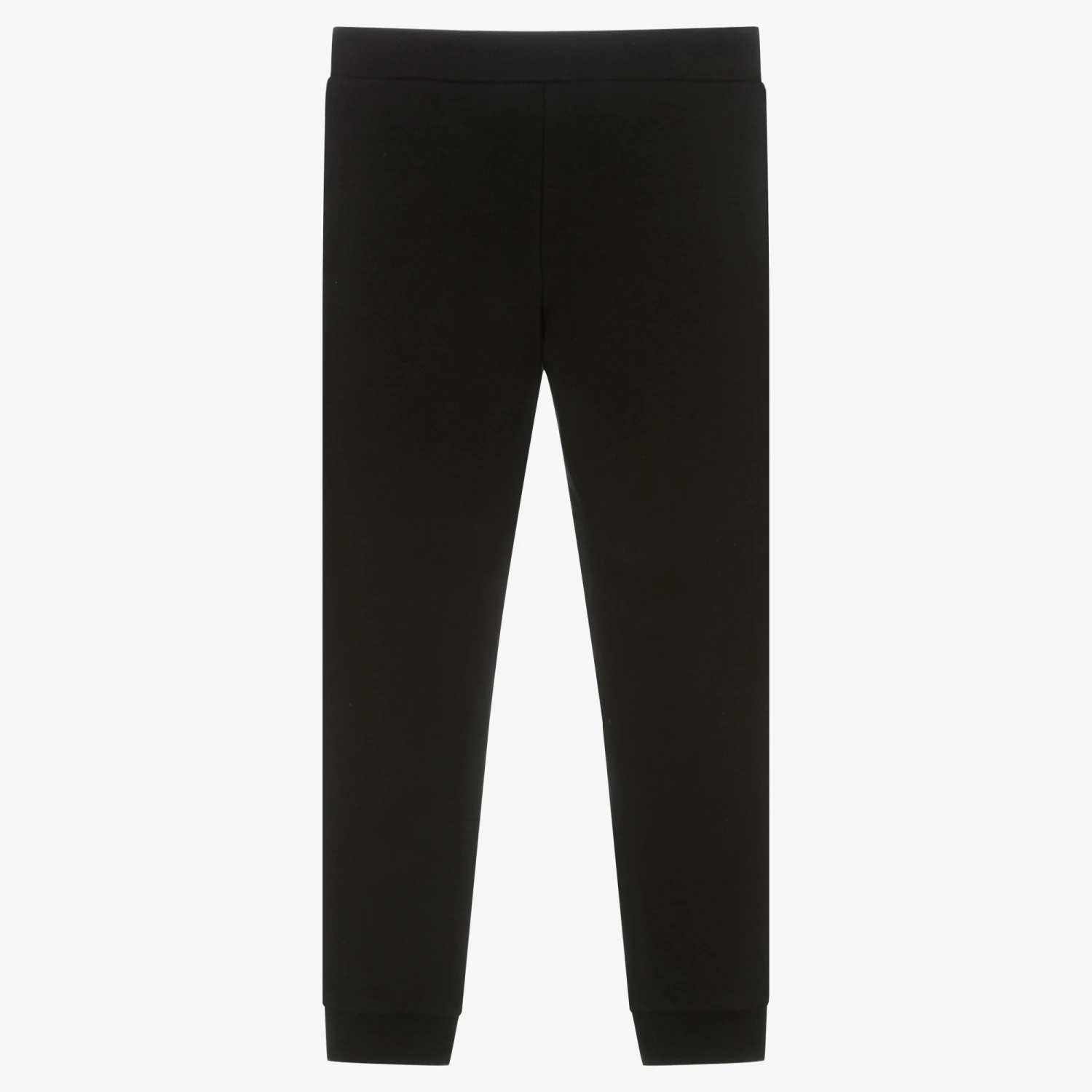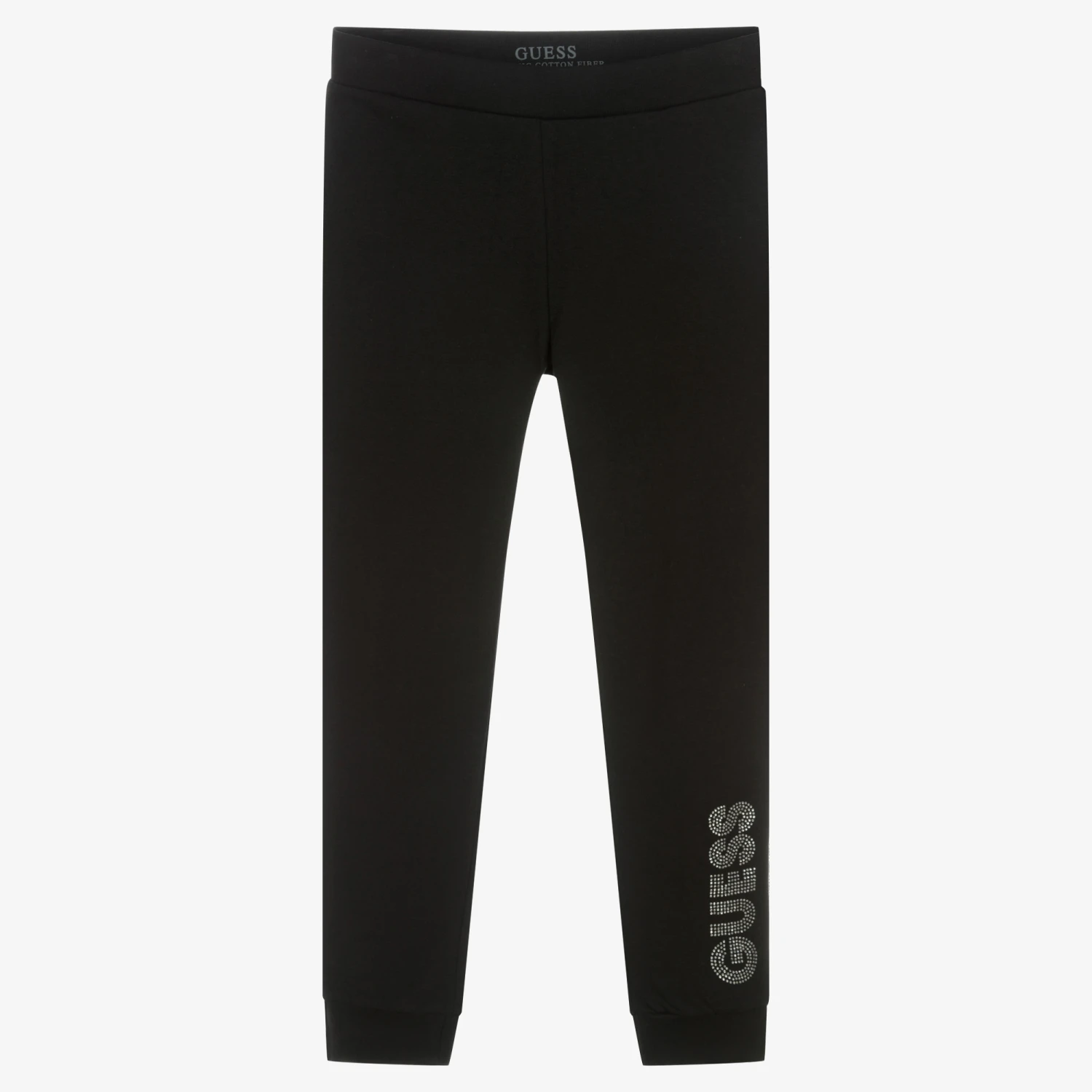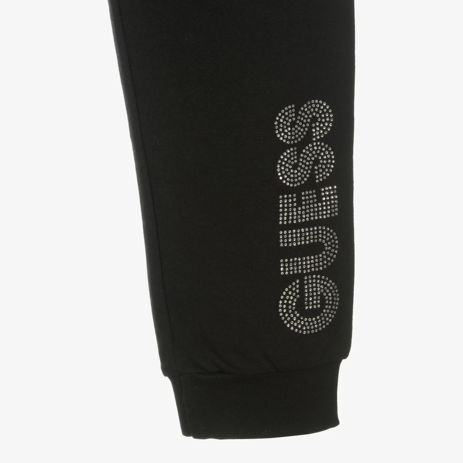 Black cotton joggers for girls by Guess, made in comfortable, lightweight jersey, ideal for relaxing in. There is a bold diamanté logo on one leg to add a little sparkle. The waistband is gently elasticated for a good fit and the matching cuffs keep ankles cosy.