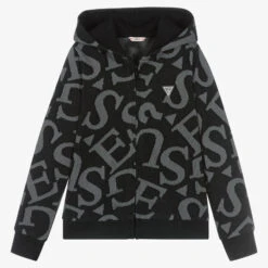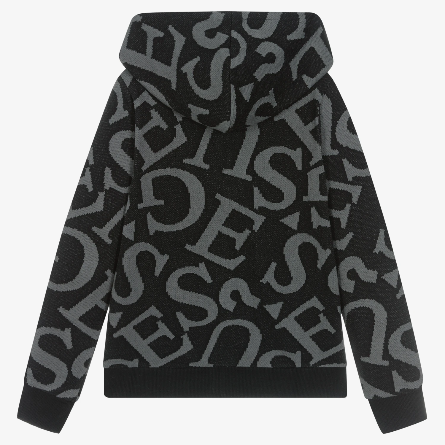 Girls black hooded zip-up top by Guess, made in mid-weight cotton jersey. It has an all-over grey jacquard logo pattern and a rubber Triangle logo patch on the front.