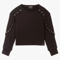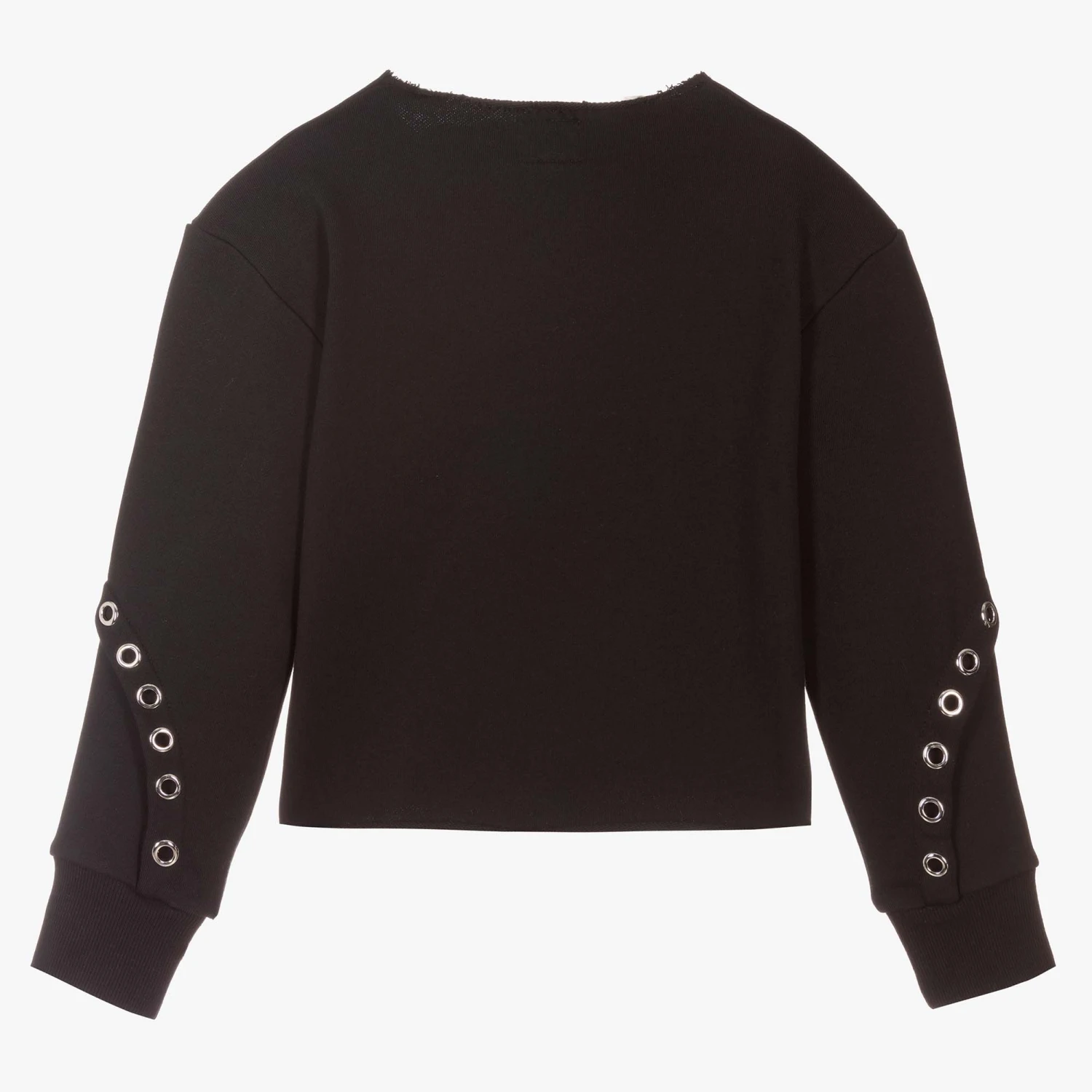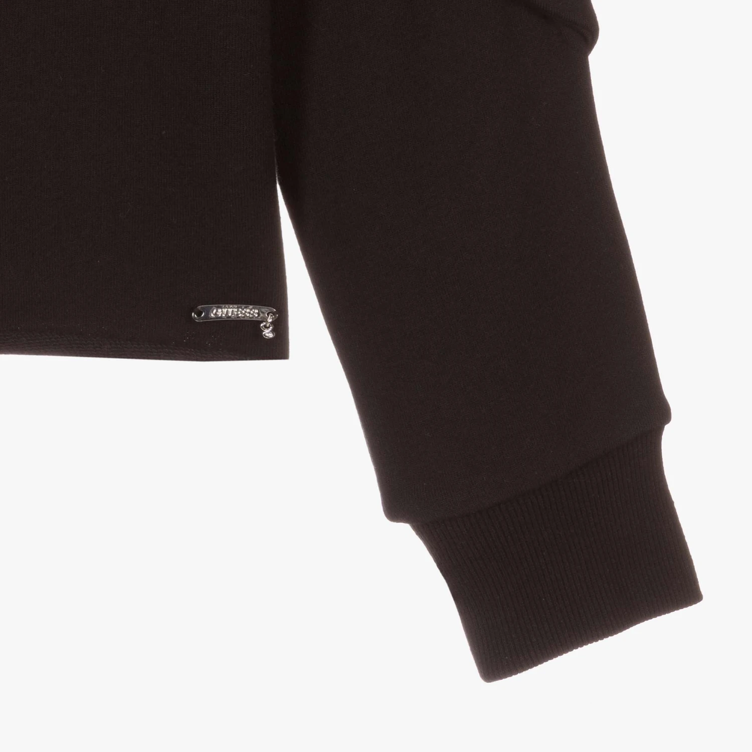 Girls black sweatshirt from Guess, made in mid-weight organic cotton jersey. It has raw-edged seams and silver eyelet studs on the sleeves. The cuffs are ribbed and there is a metal logo plaque on the hemline.