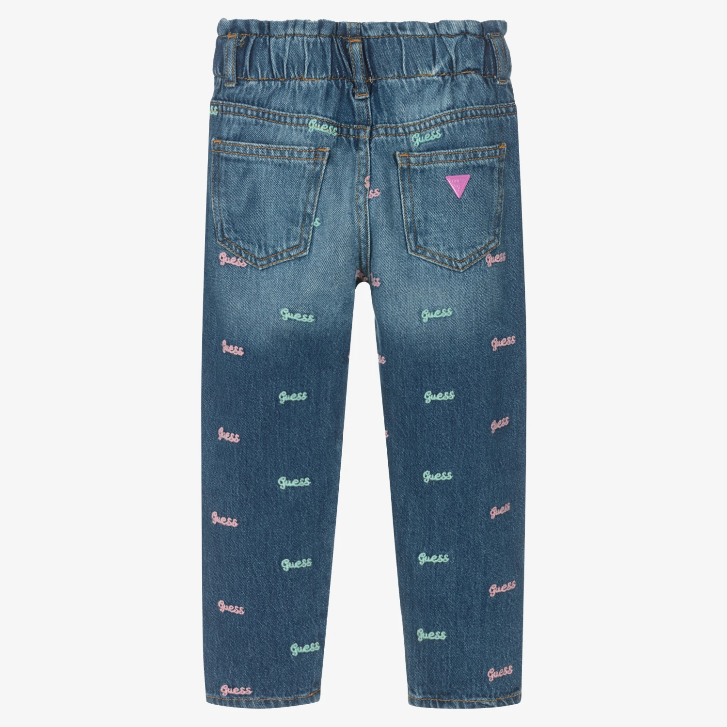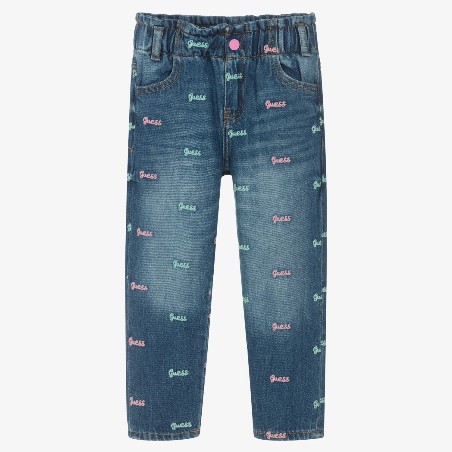 Cool blue denim jeans for girls from American brand Guess. They have a timelessly cool style with a paper bag waist, loose fit and slightly tapered leg. Embroidered all-over in pink and blue is the brand’s logo for a designer touch, further enhanced with a pink branded popper fastening and Triangle logo metal work on a back pocket.