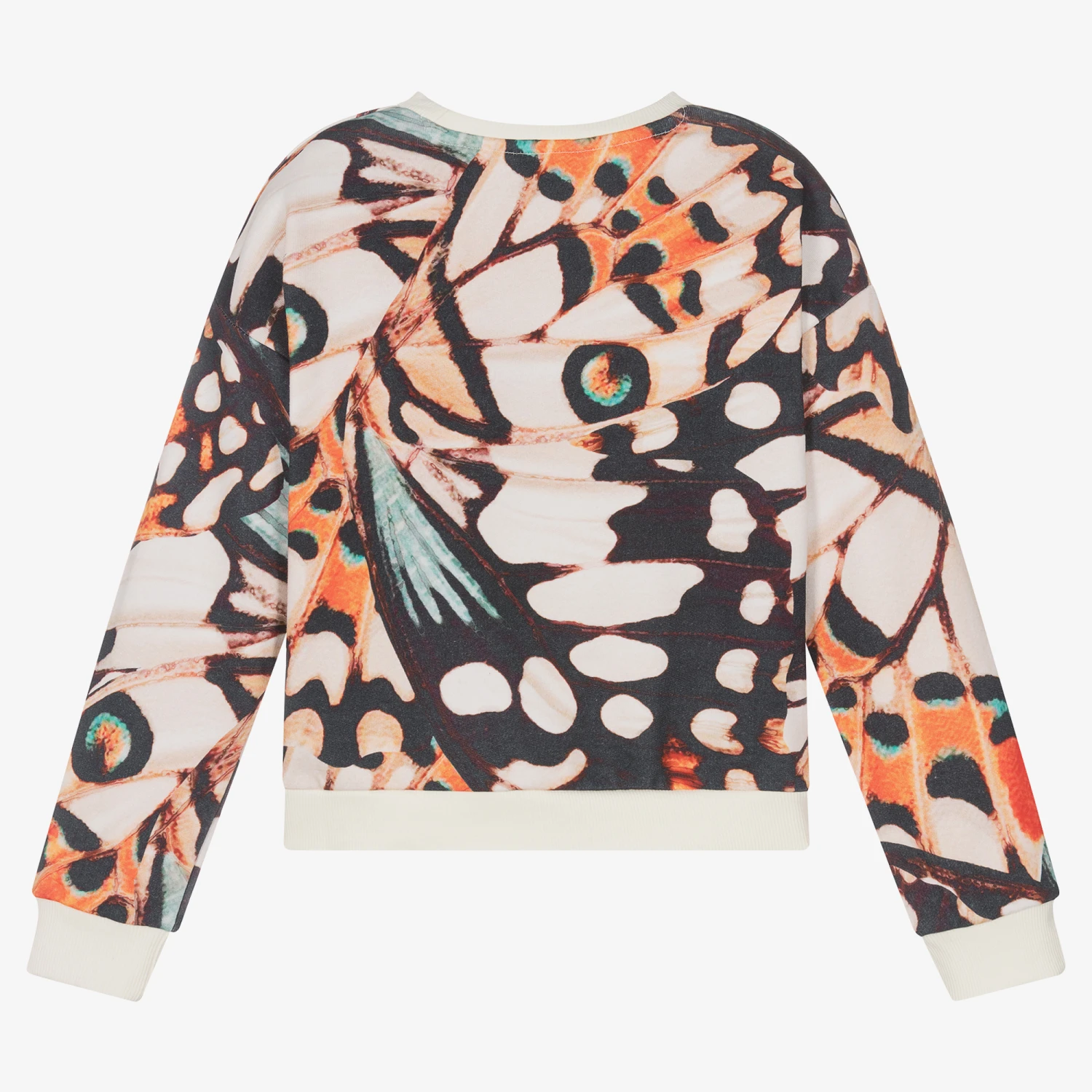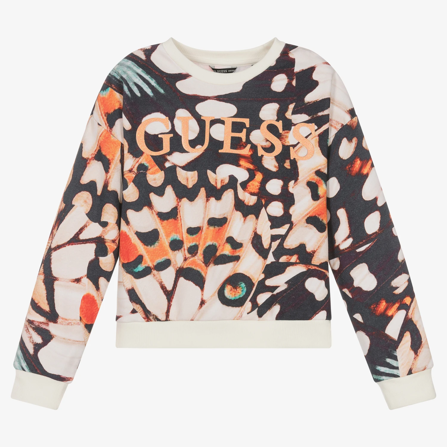 An ivory sweatshirt for girls by American brand Guess, made in mid-weight cotton jersey. Unique with a colourful butterfly print, it has a coral pink glittery logo print on the chest. It has a classic crew neck and ribbed trims for added comfort. This item contains in-conversion cotton fibres.