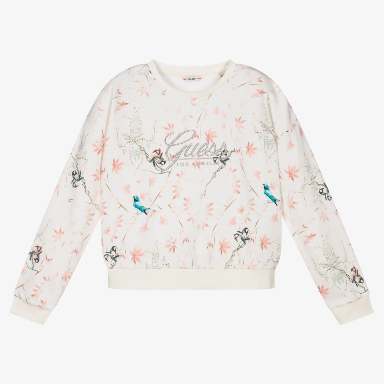 Cute ivory cropped sweatshirt for girls by Guess, made in soft and mid-weight cotton jersey. It has a pink autumnal leaf print, with blue birds and a sparkly silver embroidered logo on the front.