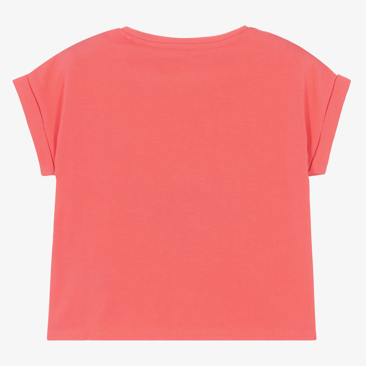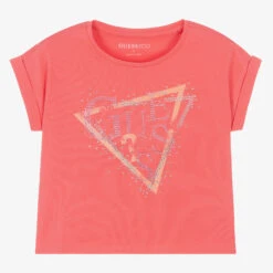 In a gorgeous coral pink shade, this cotton T-shirt for girls is by Guess. Soft and comfortable to wear, it has a slightly cropped boxy shape and seamless capped sleeves with turn-up cuffs. Adding a glamorous touch, the American brand’s recognisable Triangle logo is on the front in pale pink print and sparkly diamantés.