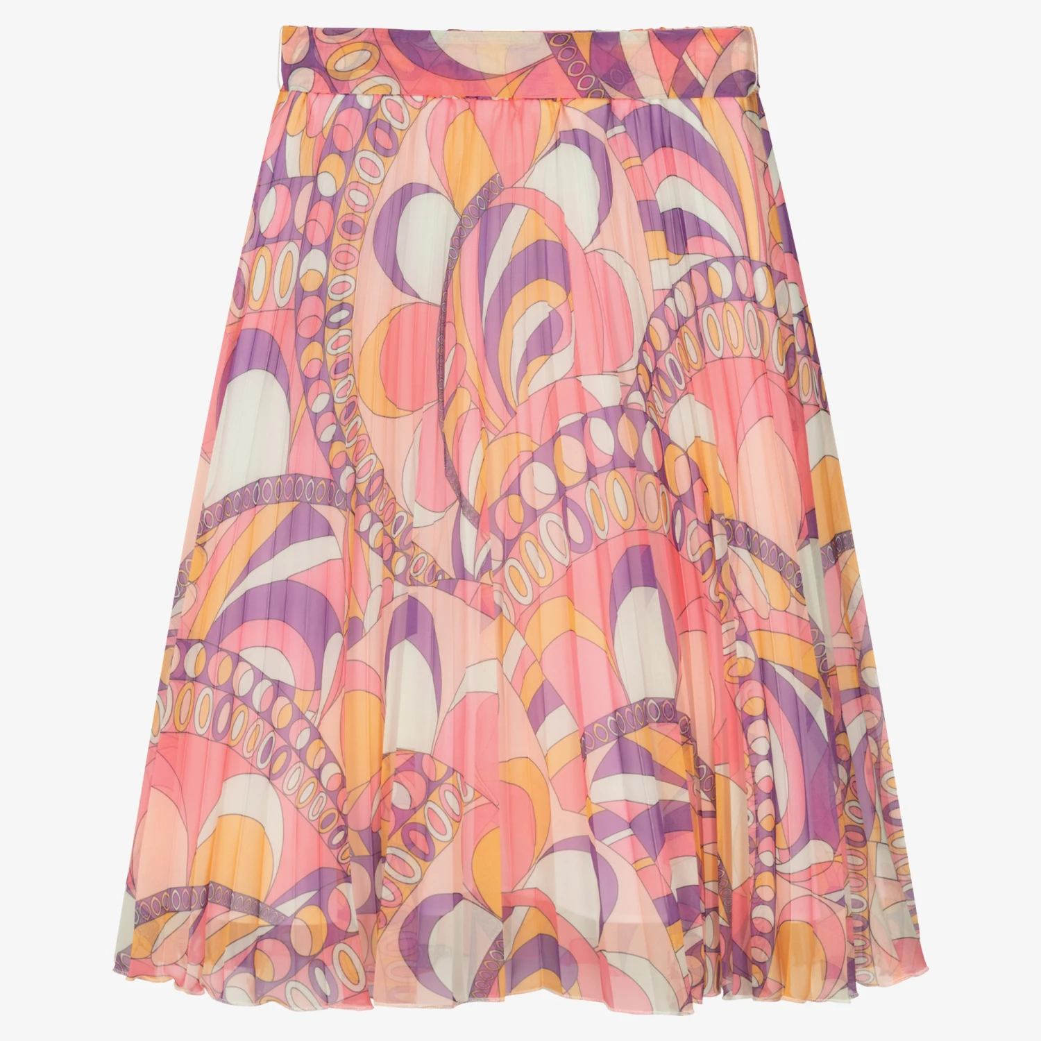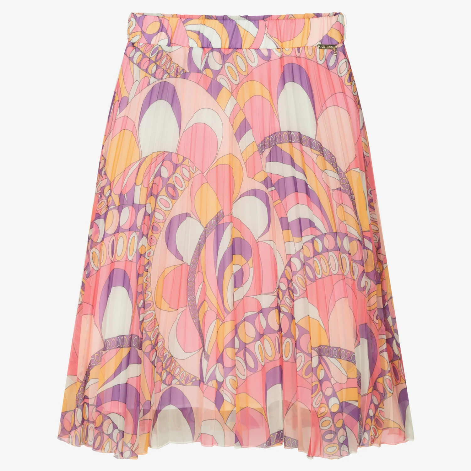 A pink, purple and orange skirt for girls by Guess, in a playful psychedelic design. Flowy and lightweight, this pleated skirt is easy-to-style, with a gold diamanté charm logo on the front. It has a comfortably soft lining, and a removable sash belt to beautifully define the waist.