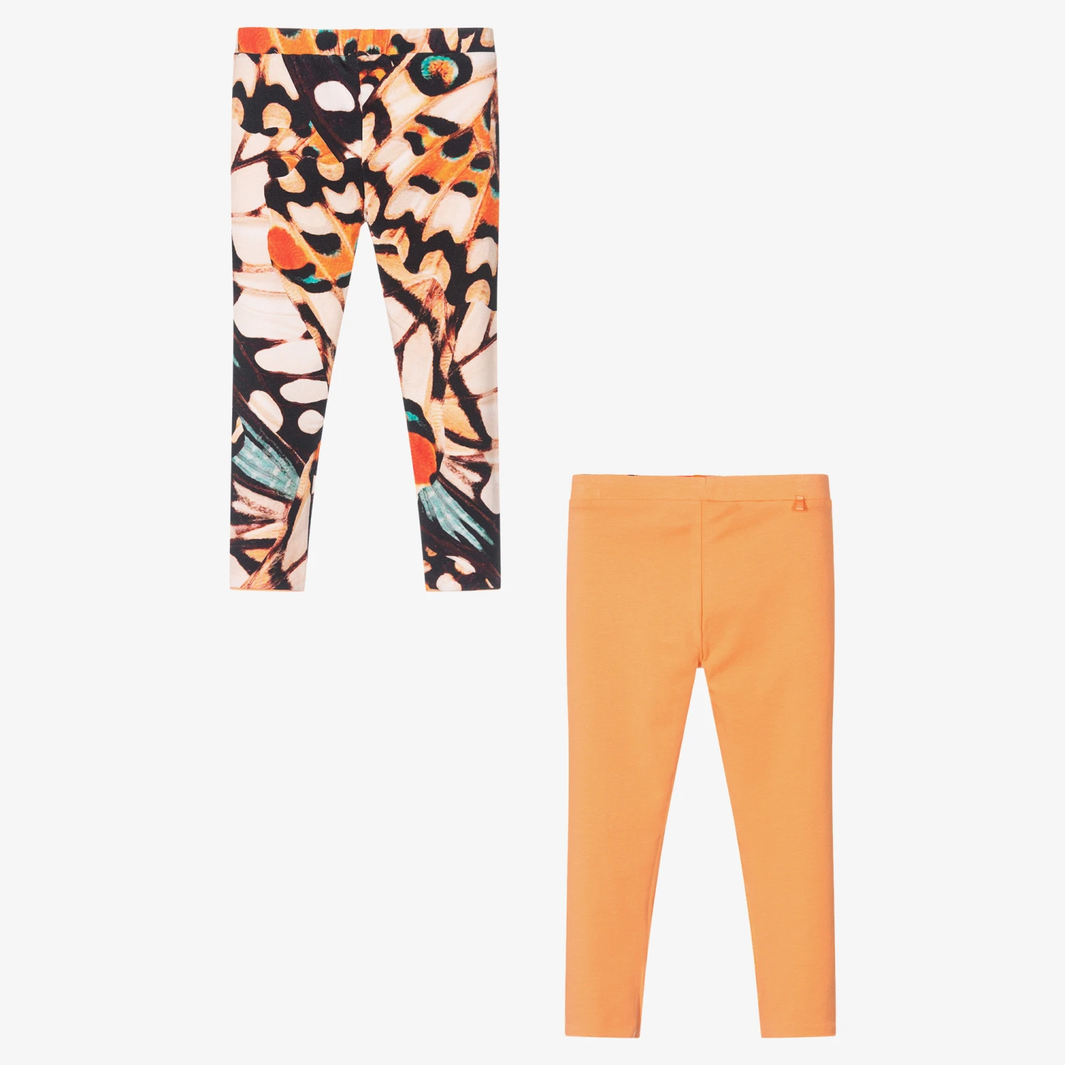 Reversible, full length cotton leggings for girls by American brand Guess, made in comfortable, double-layered jersey. One side has an abstract butterfly wing pattern in orange, beige, black and blue, whilst the other side is plain orange. Both sides have an elasticated waist and the brand’s logo on one leg.