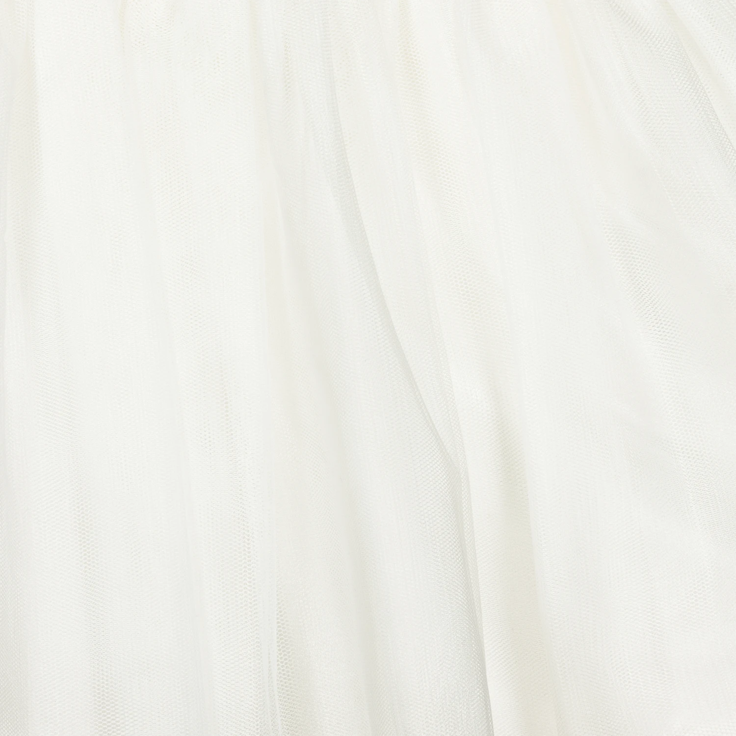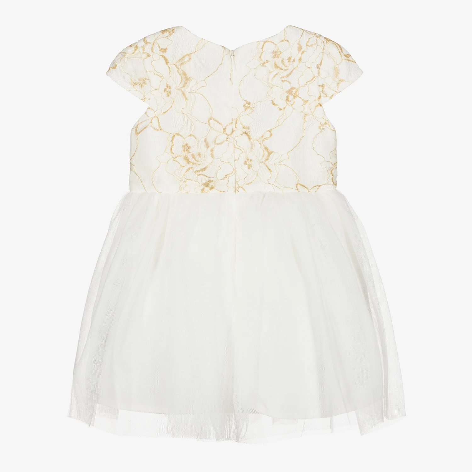 Gorgeous white dress for little girls from Guess. The bodice is made in intricate, luxurious lace, accented with shimmering golden-threaded flowers and detailed with a silky logo-charm bow on the waist. The lovely skirt is made in layers of soft tulle, with a silky satin underlayer and comfortable cotton lining. It fastens with a neat hidden zip on the back. Included are white cotton knickers with an elasticated waist, gentle on tiny tummies.