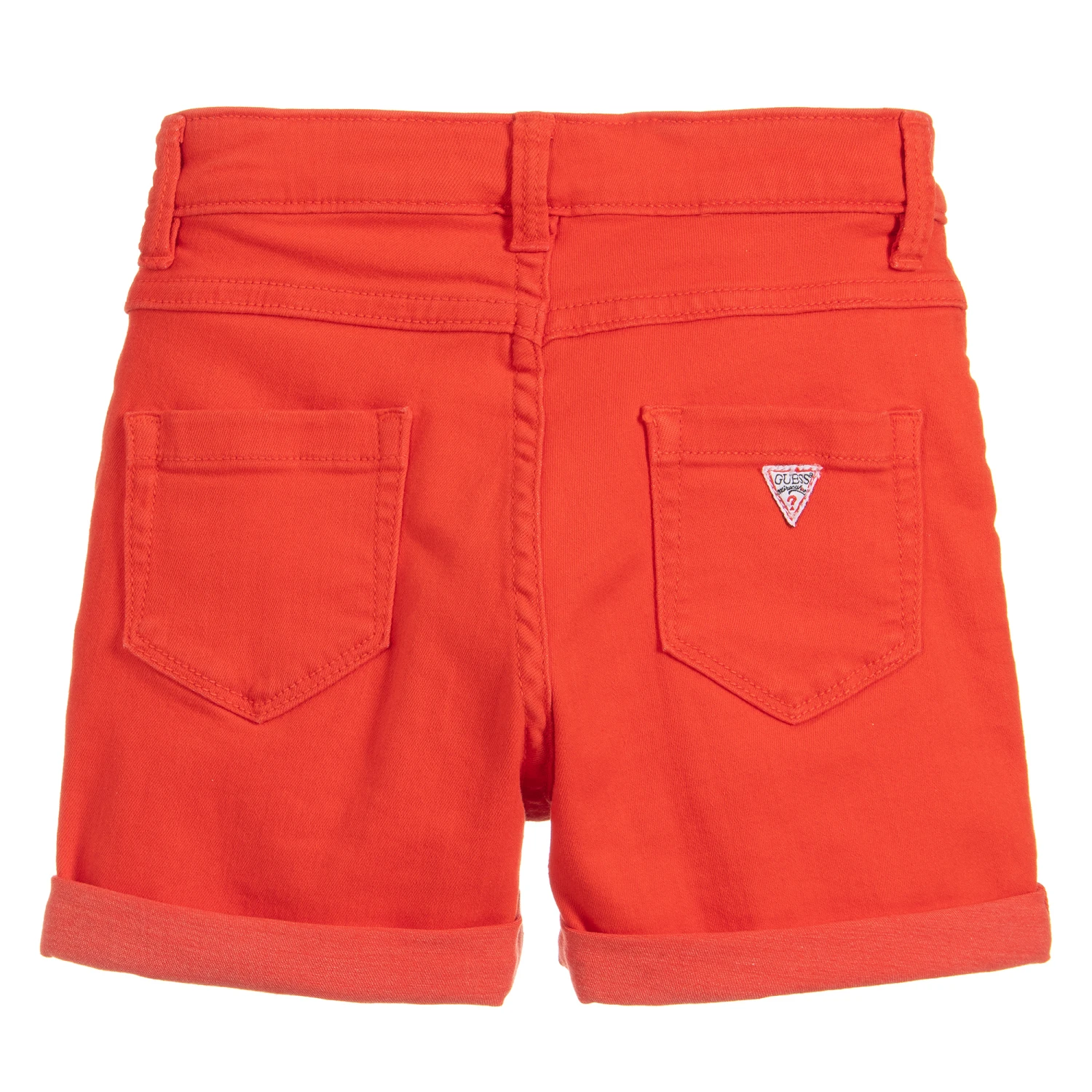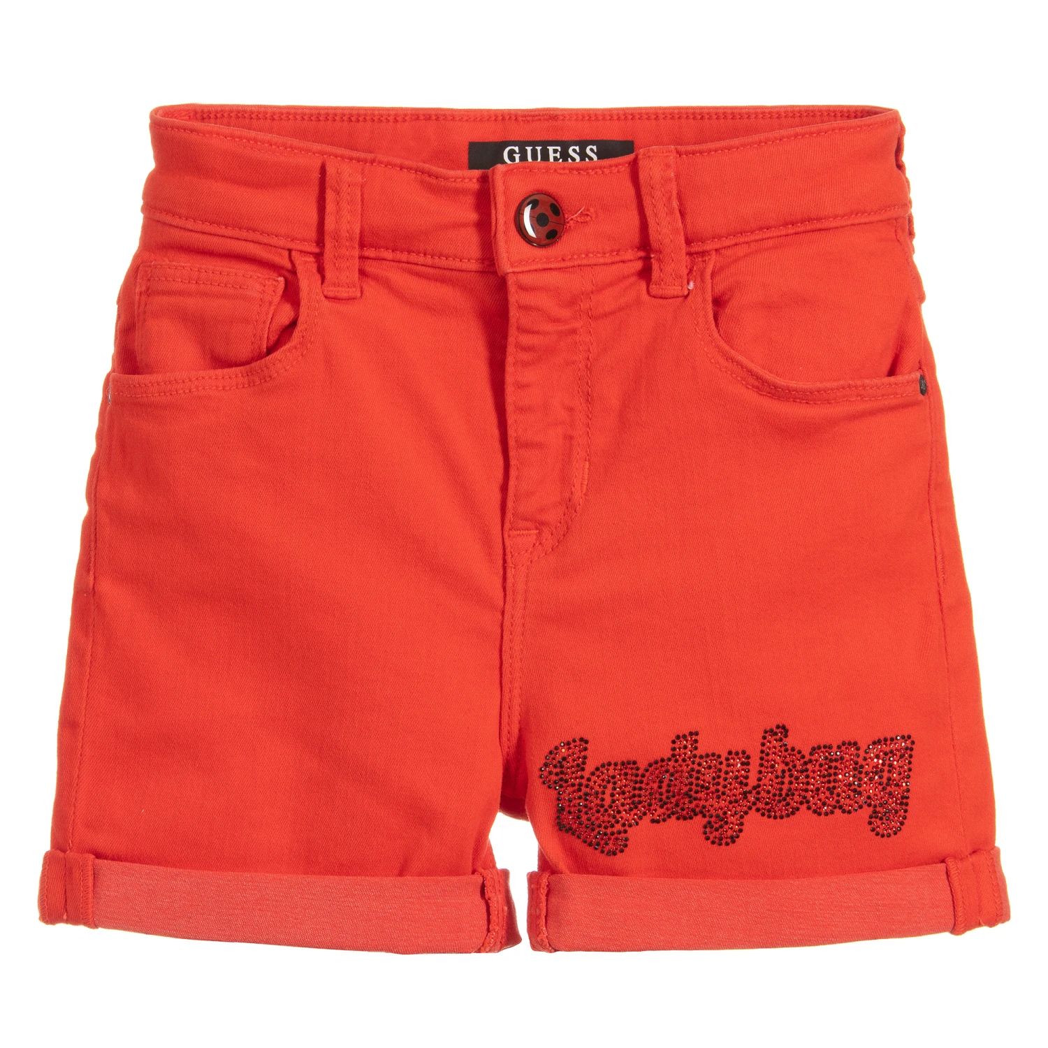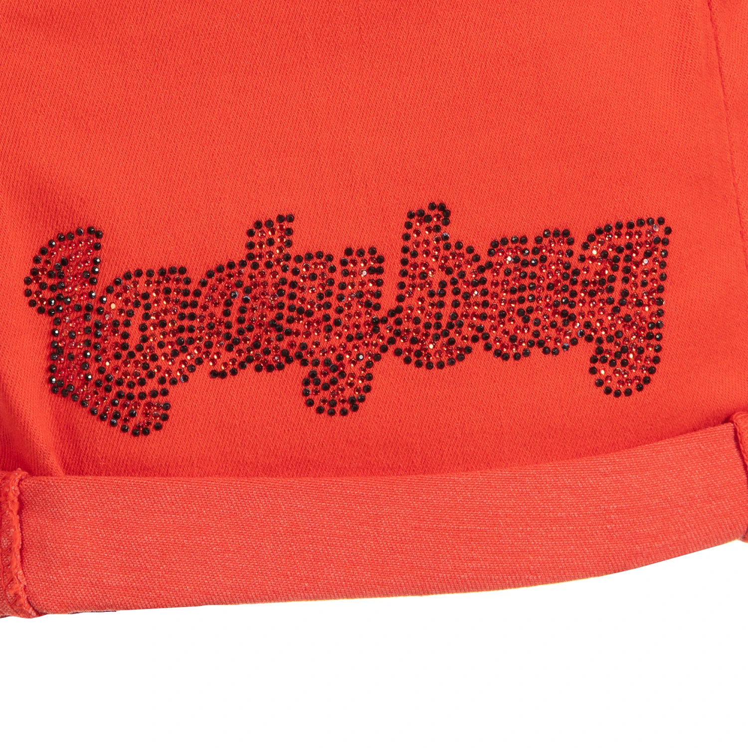 Girls red shorts by Guess x “Be Miraculous” made in soft and stretchy cotton twill. They are hand beaded, with a sparkling red and black ‘Ladybug’ on the front and have microcapsules of essential oils creating a fruity scent. Fastening with a ladybug button and zip, they have an adjustable waistband.