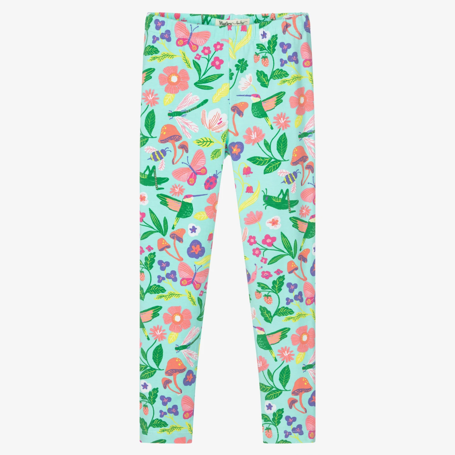 Green leggings for little girls by Hatley, patterned in a pretty and colourful garden print. They are made in soft cotton jersey and have a comfortable elasticated waistband.