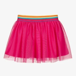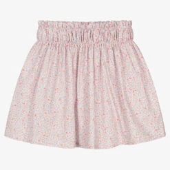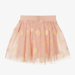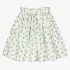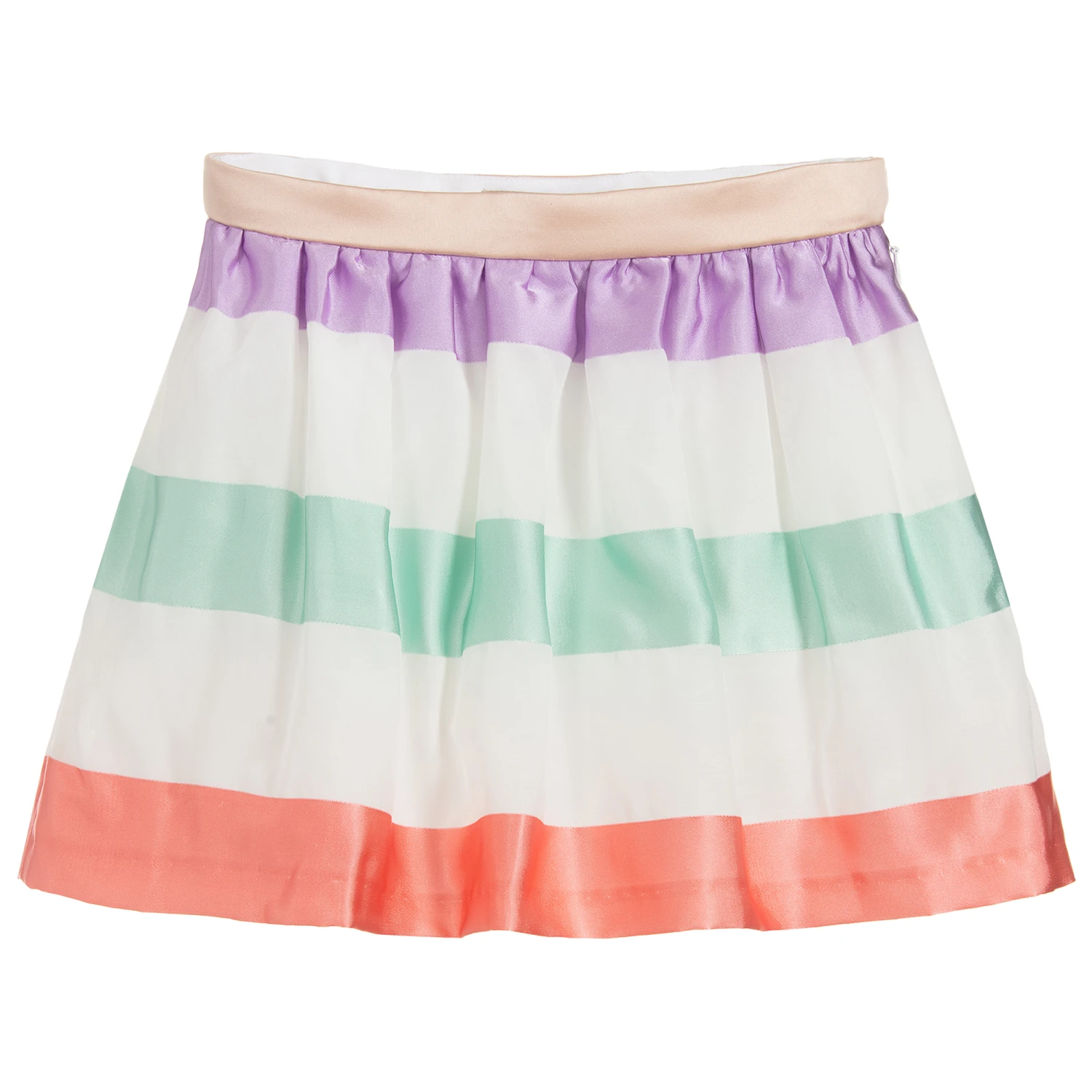 A lovely skirt by Hucklebones London, made in gathered pink, ivory and green striped layers of satin and organza, with a silky lining and tulle to give it volume. It has a hidden zip fastening on one side, with an adjustable waist for growing girls.