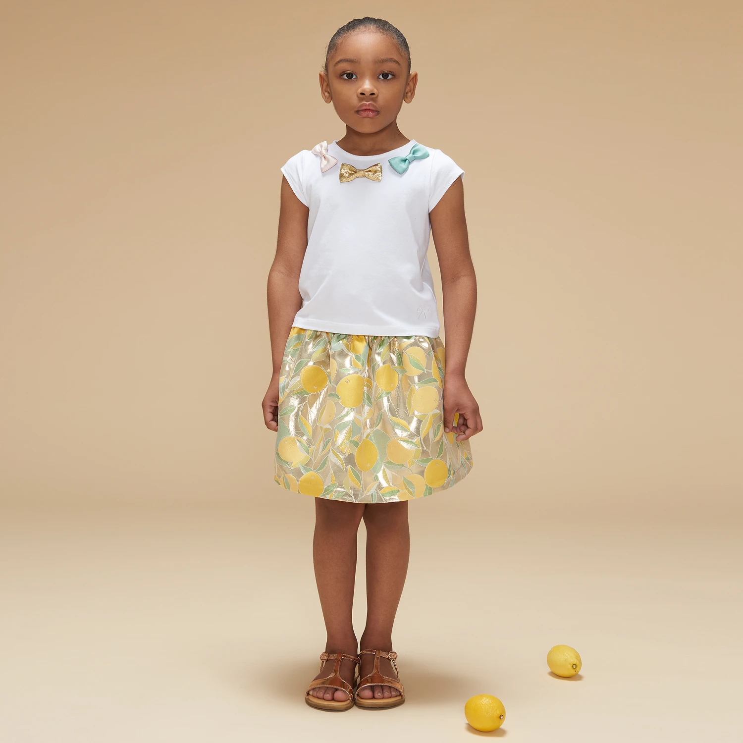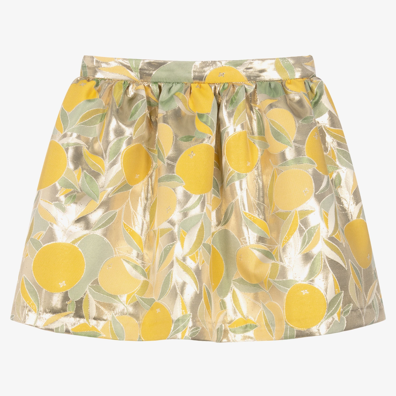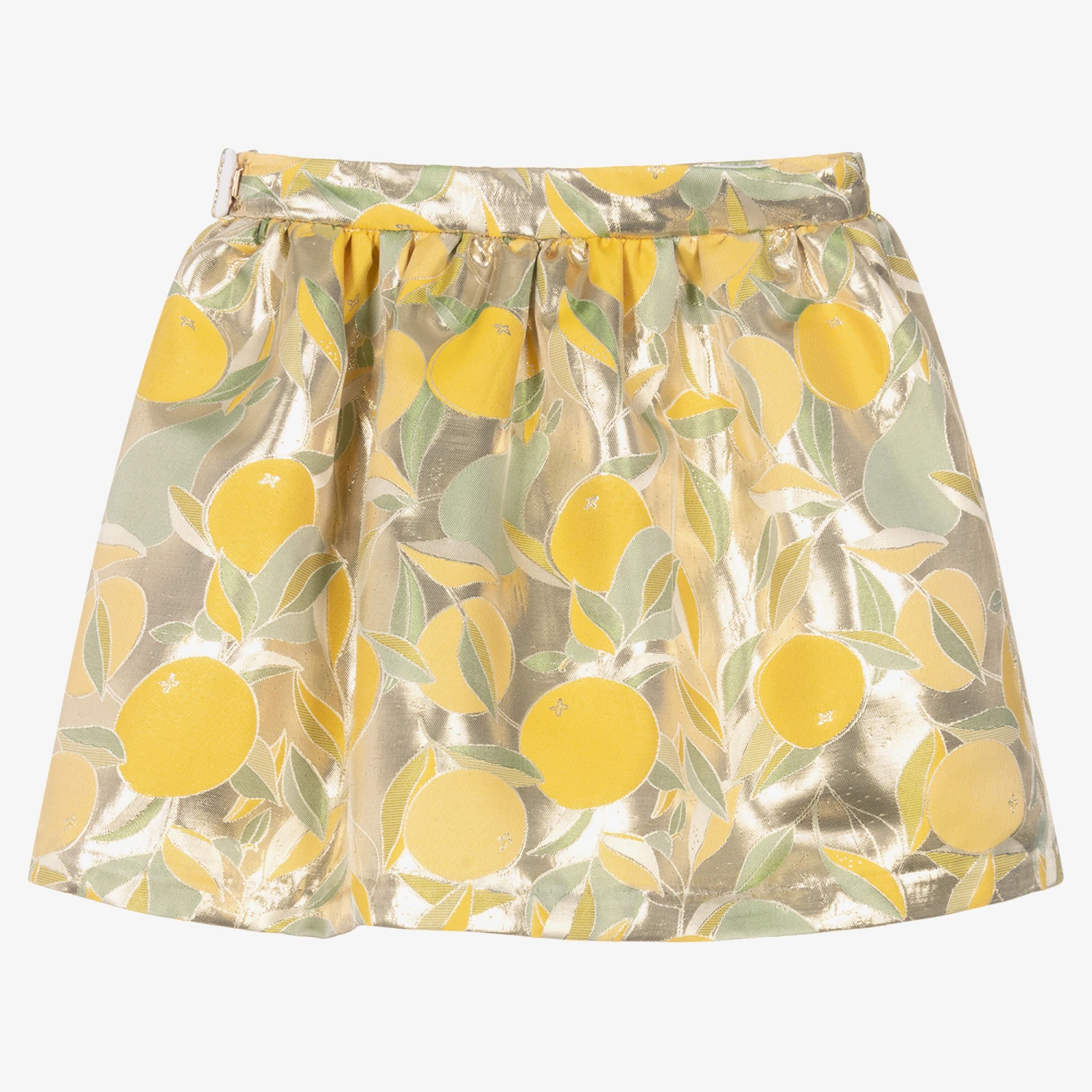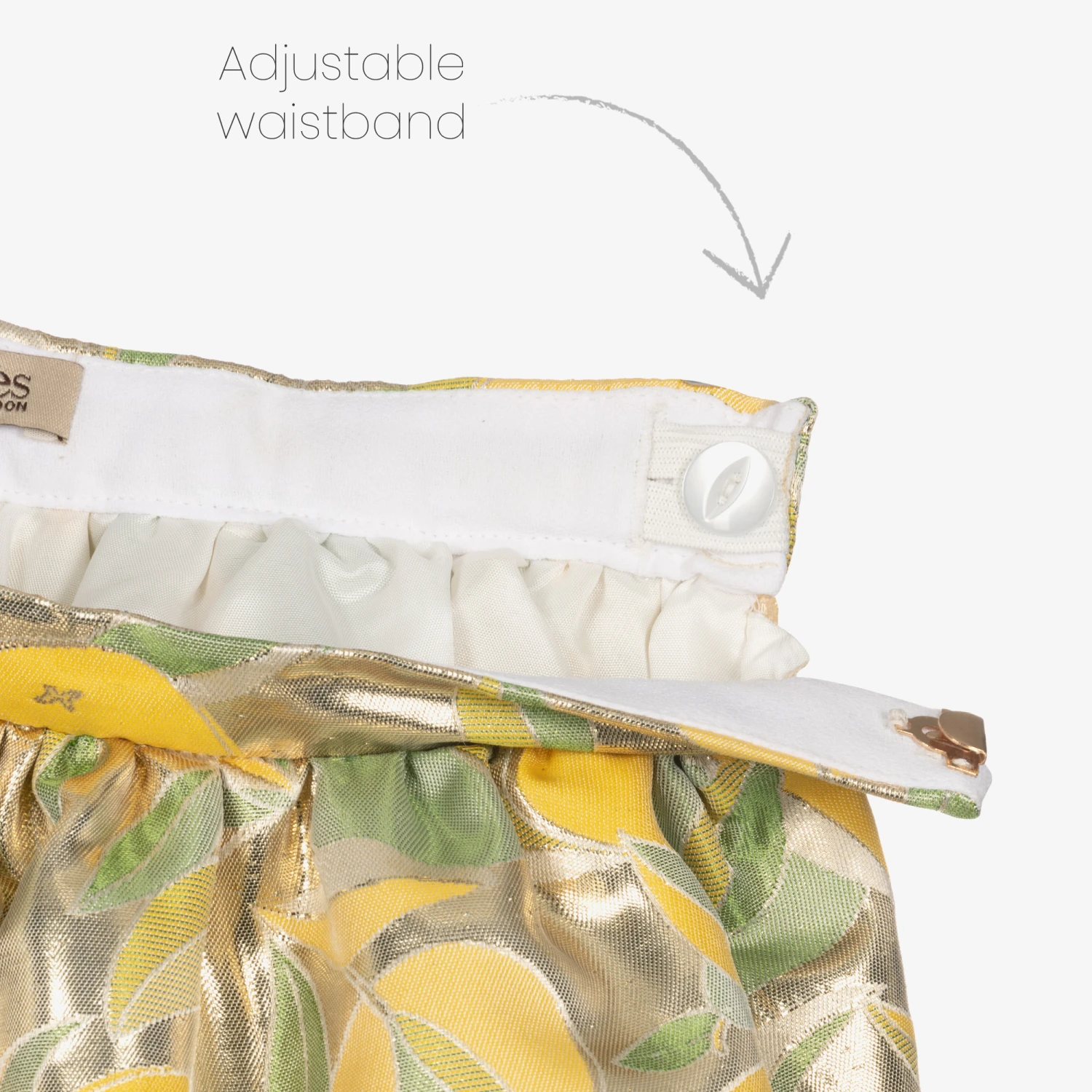 Eye-catching gold lamé jacquard skirt for girls by Hucklebones London, with a yellow and green lemon pattern. It has a full gathered shape and fastens at the side with a zip and hook. The waistband is adjustable for comfort and the skirt has a lightweight satin lining with tulle underskirt for added volume.