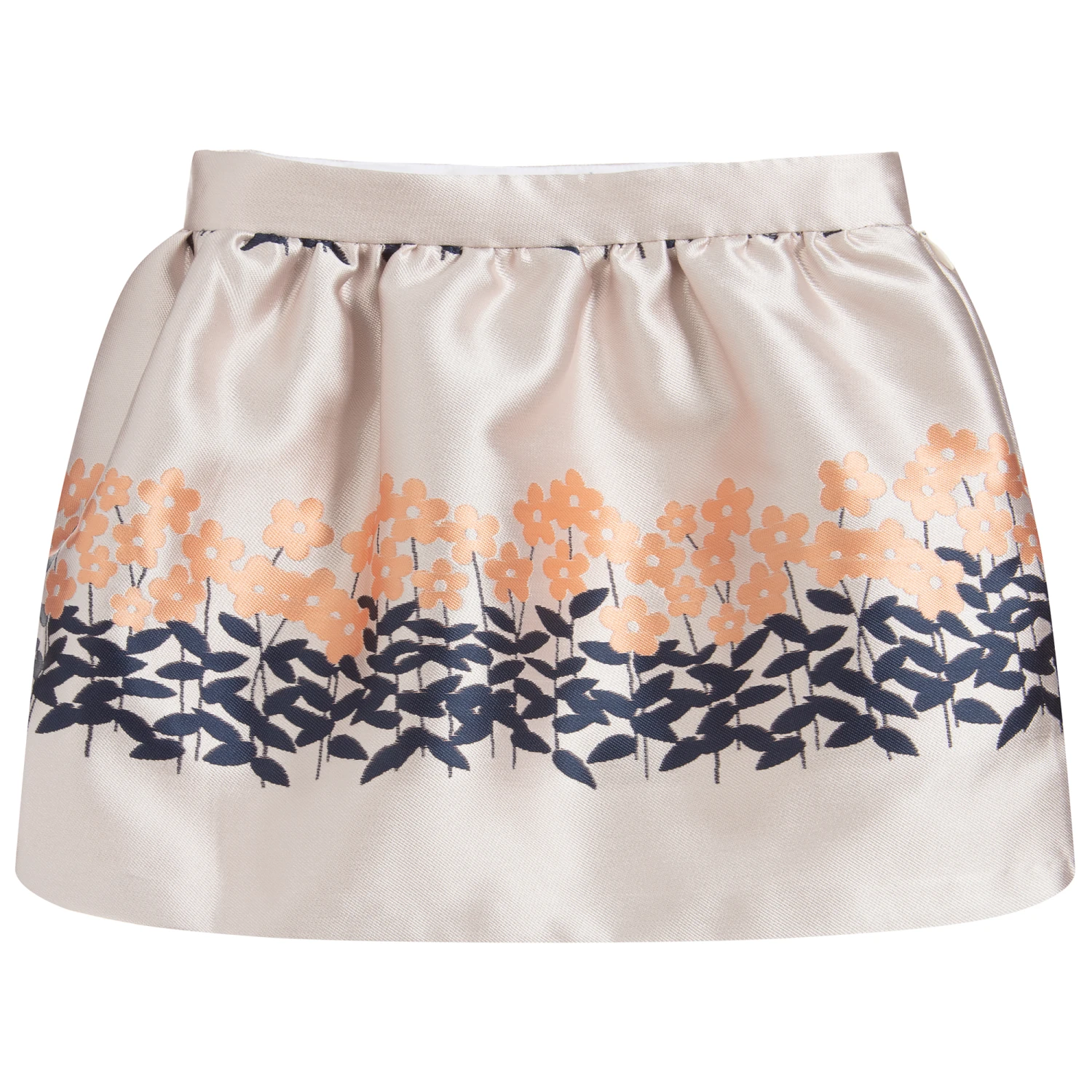 Pink jacquard skirt for girls by Hucklebones London, with an orange and navy blue floral pattern.