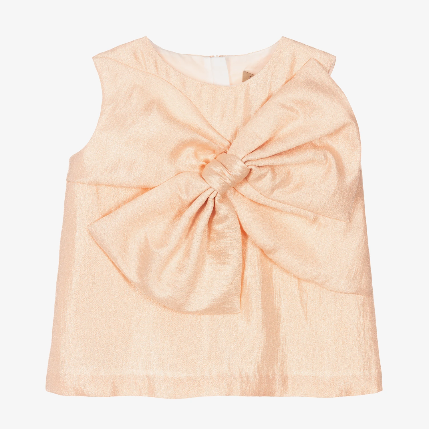Exclusive to Childrensalon, gorgeous champagne pink sleeveless blouse for girls, by British designer Hucklebones London. Made in a super soft silky viscose blend, it has a lovely oversized bow on the front, and a concealed zip fastening on the back for easy fastening.