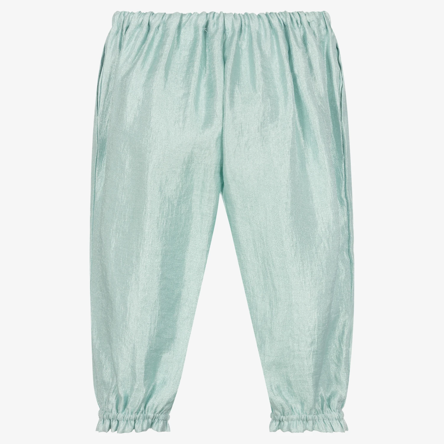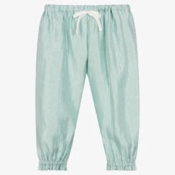 Lovely for a relaxed glamorous look, these cuffed Hucklebones London trousers for girls have a shimmering aqua blue finish. Beautifully soft and comfortable to wear, they have an adjustable, elasticated waistband, trimmed with a white crêpe bow, and useful concealed side pockets.