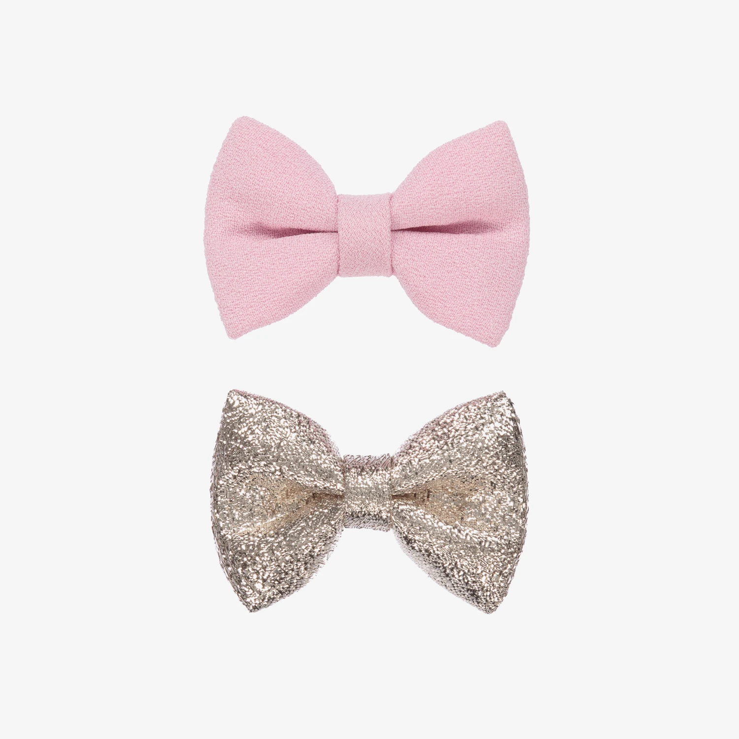 A pack of two bow hair clips for girls by Hucklebones London. One is in pink and the other is in metallic pale gold lamé. Fastening with an easy snap metal clip on the back, these little accessories will add a lovely finishing touch to any outfit.