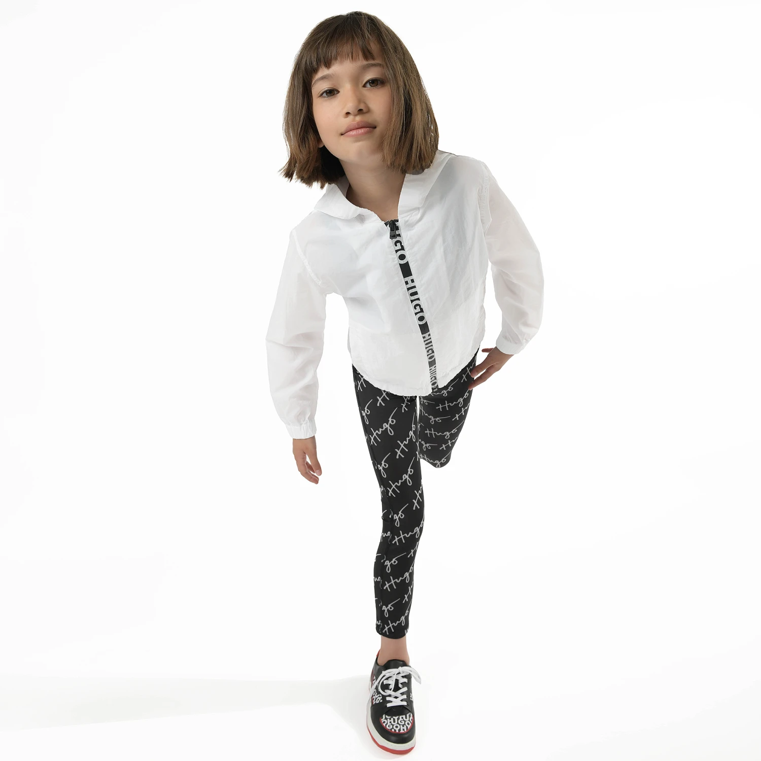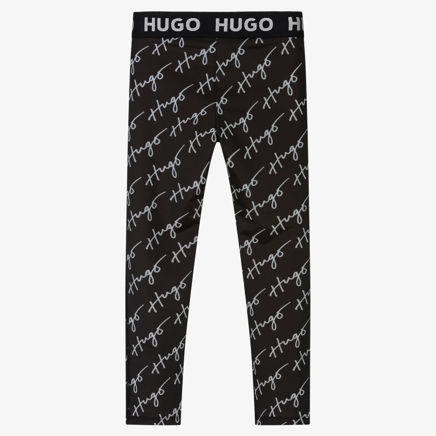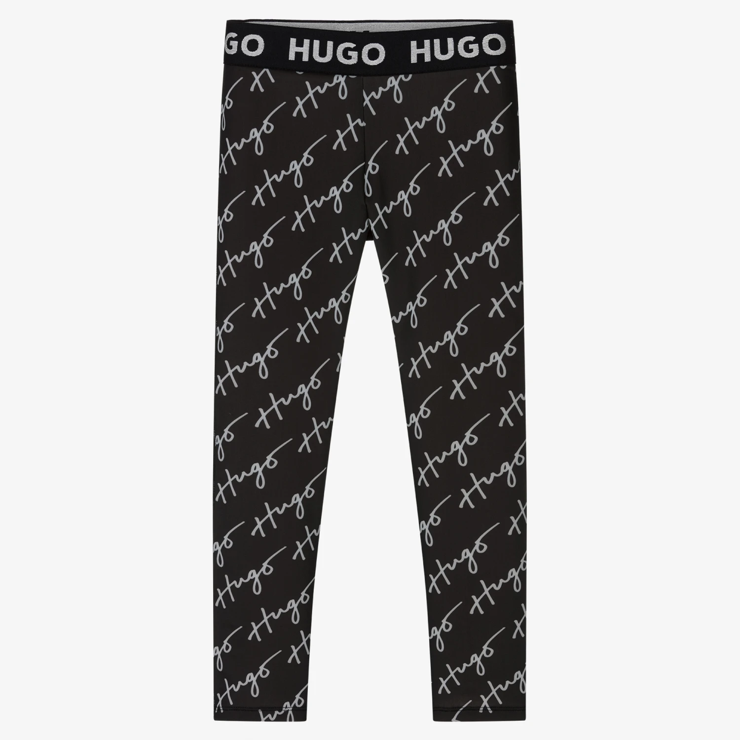 Black leggings for girls by HUGO, made in silky smooth and stretchy jersey, with an all over silver signature logo pattern. Ideal for sporting activities, they have a black elasticated waistband with silver jacquard logos.