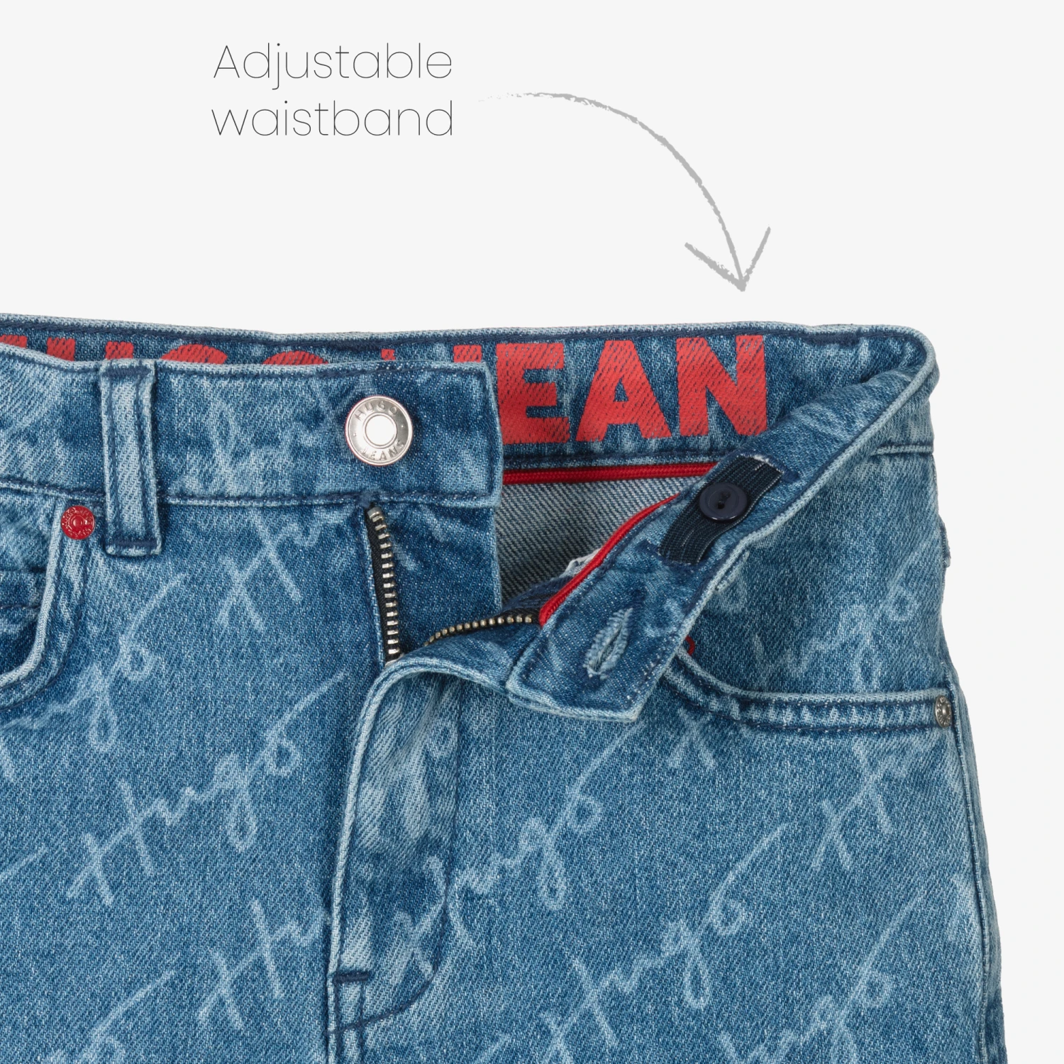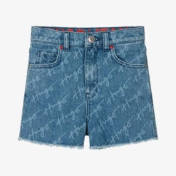 Blue denim shorts for girls by HUGO, with an all over HUGO signature logo pattern. They have classic five pocket styling, with on trend frayed hems and a red and black branded rubber jacron on the back. They fasten with a button and zip and have a useful adjustable waistband for an ideal fit.