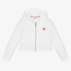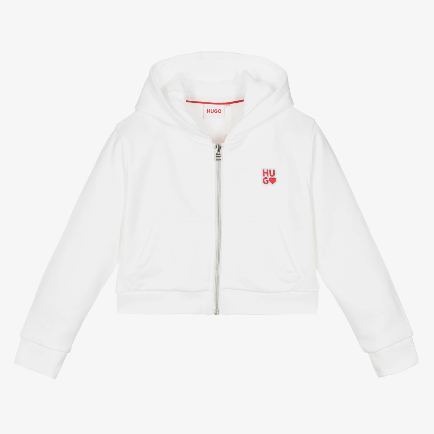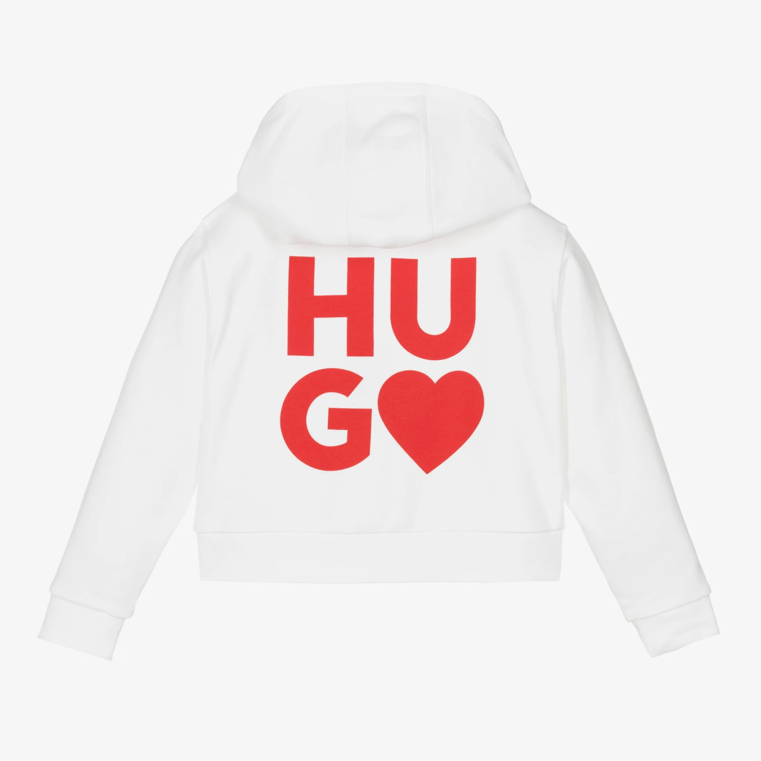 White, hooded zip-up top for girls by HUGO, made in soft cotton sweatshirt jersey. This casual top has a boxy cut and comfortable ribbed trims. It has a large eye-catching red logo and heart print on the back, creating an instant statement. There are useful pockets on the front and a small red logo and heart appliqué on the chest. It fastens on the front with a silver zip, with a logo branded pull. This item contains at least 60% organic cotton.