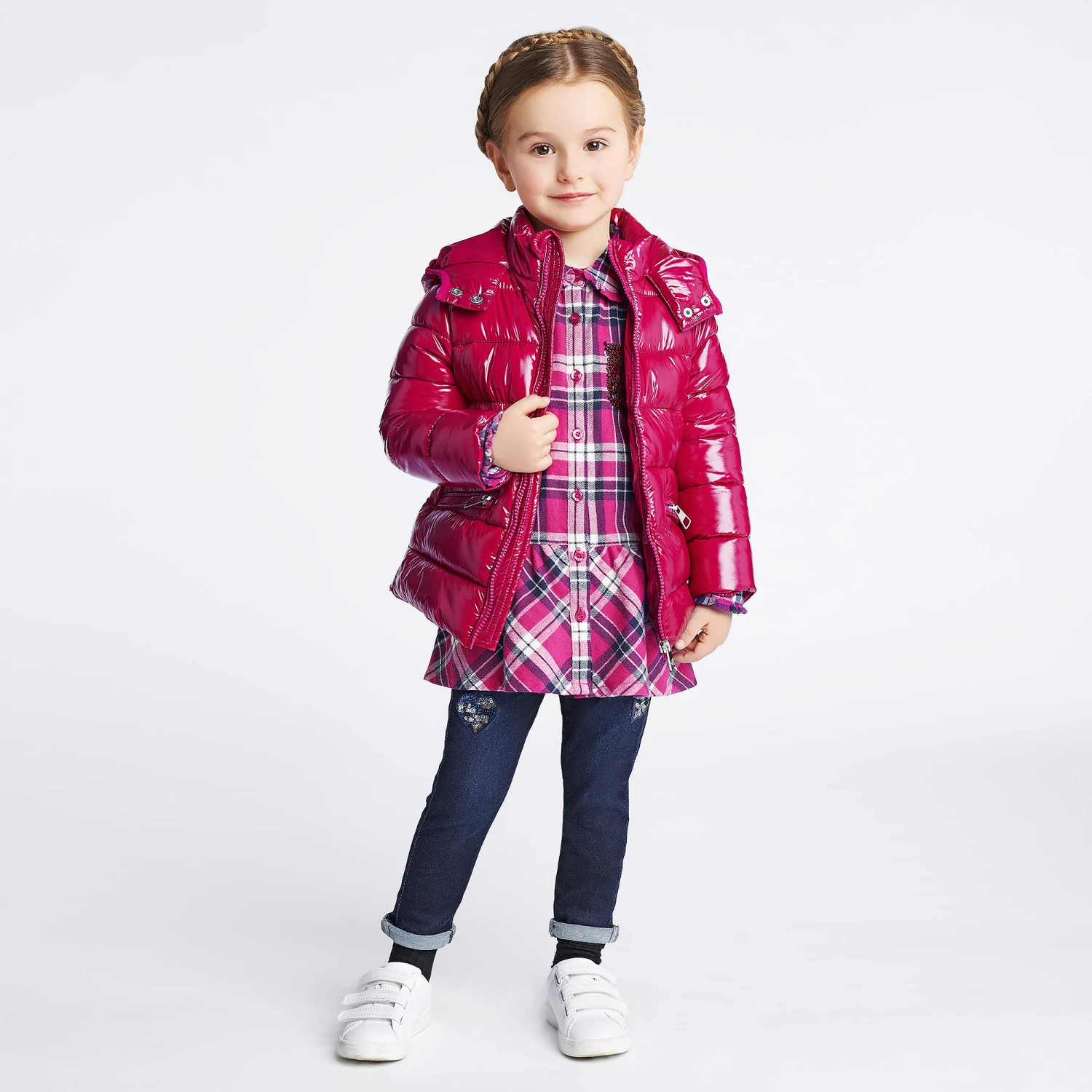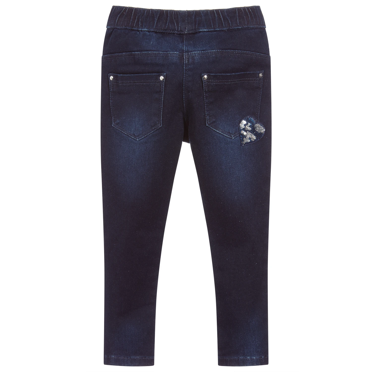 Girls dark blue stretch denim jeggings by iDO Baby, with blue and silver sequinned hearts. Easy to pull on, they have an elasticated waistband and five pockets.