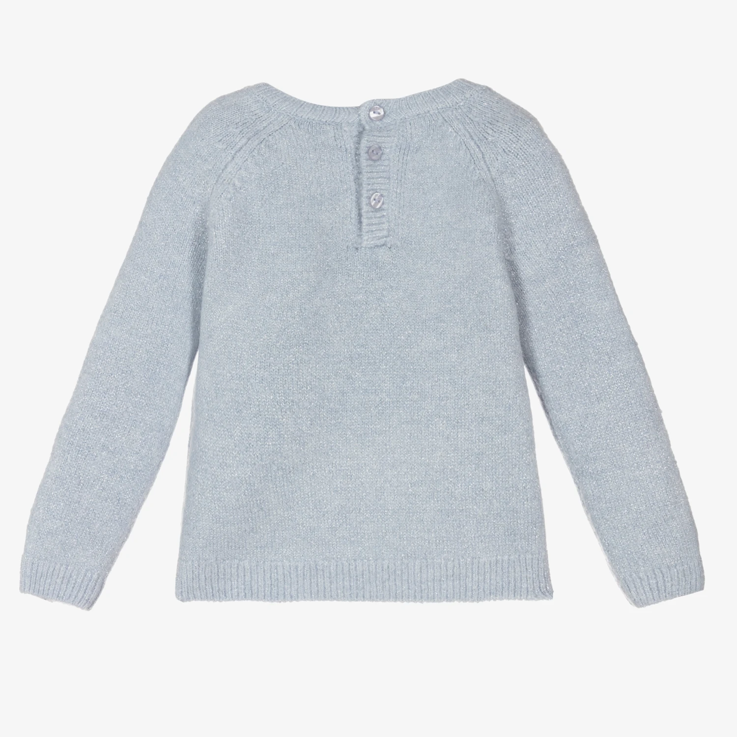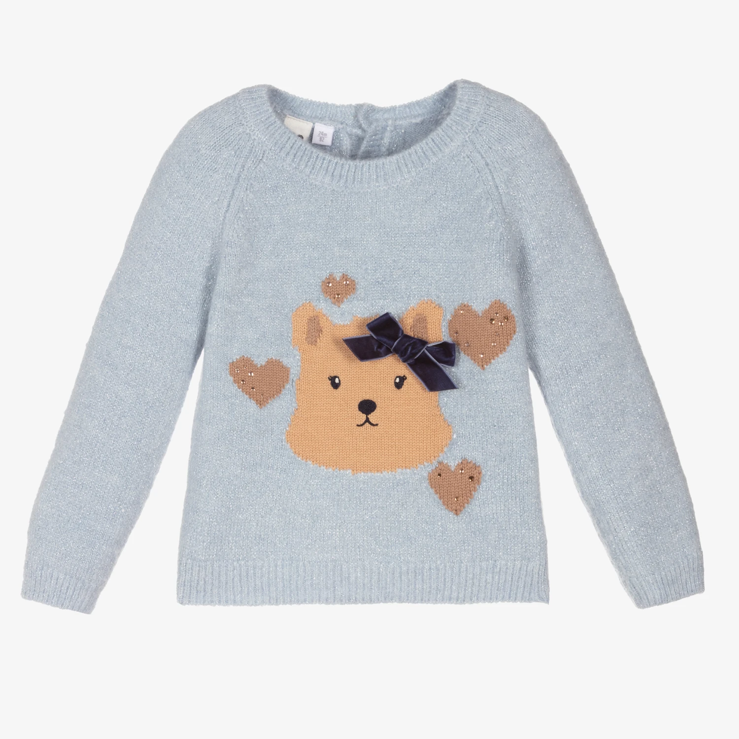 Pretty shimmery blue sweater for girls, by iDO Baby. Knitted in a beautifully soft wool blend, it has a sweet brown bear and hearts motif on the front, with diamanté trims and a navy blue velvet bow appliqué for a cute girly look. There are button fastenings on the back.