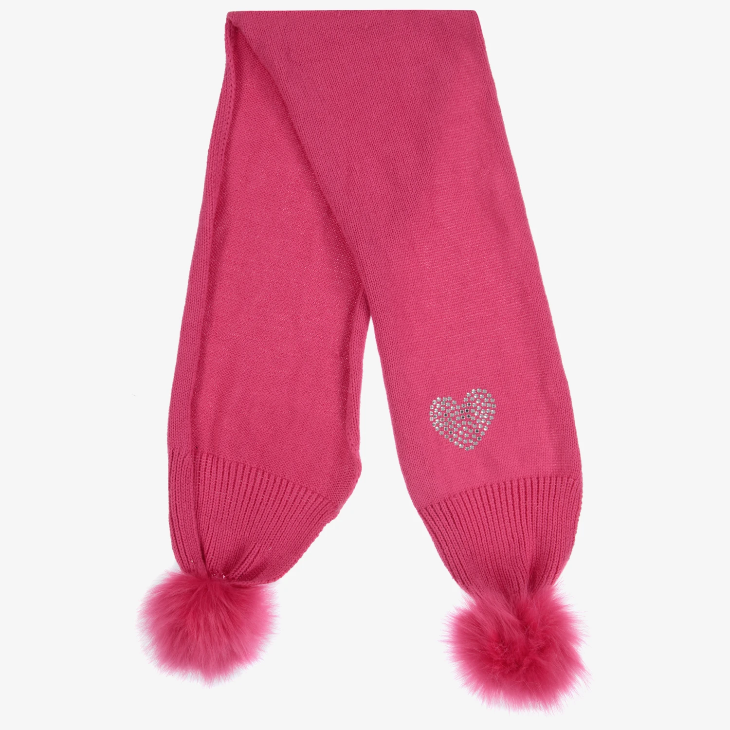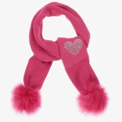 Girls knitted scarf by iDO Baby, in fuchsia pink. Made from a blend of wool and cotton, it has a bright sparkly diamanté heart logo and fun faux fur pom-poms on the ends.