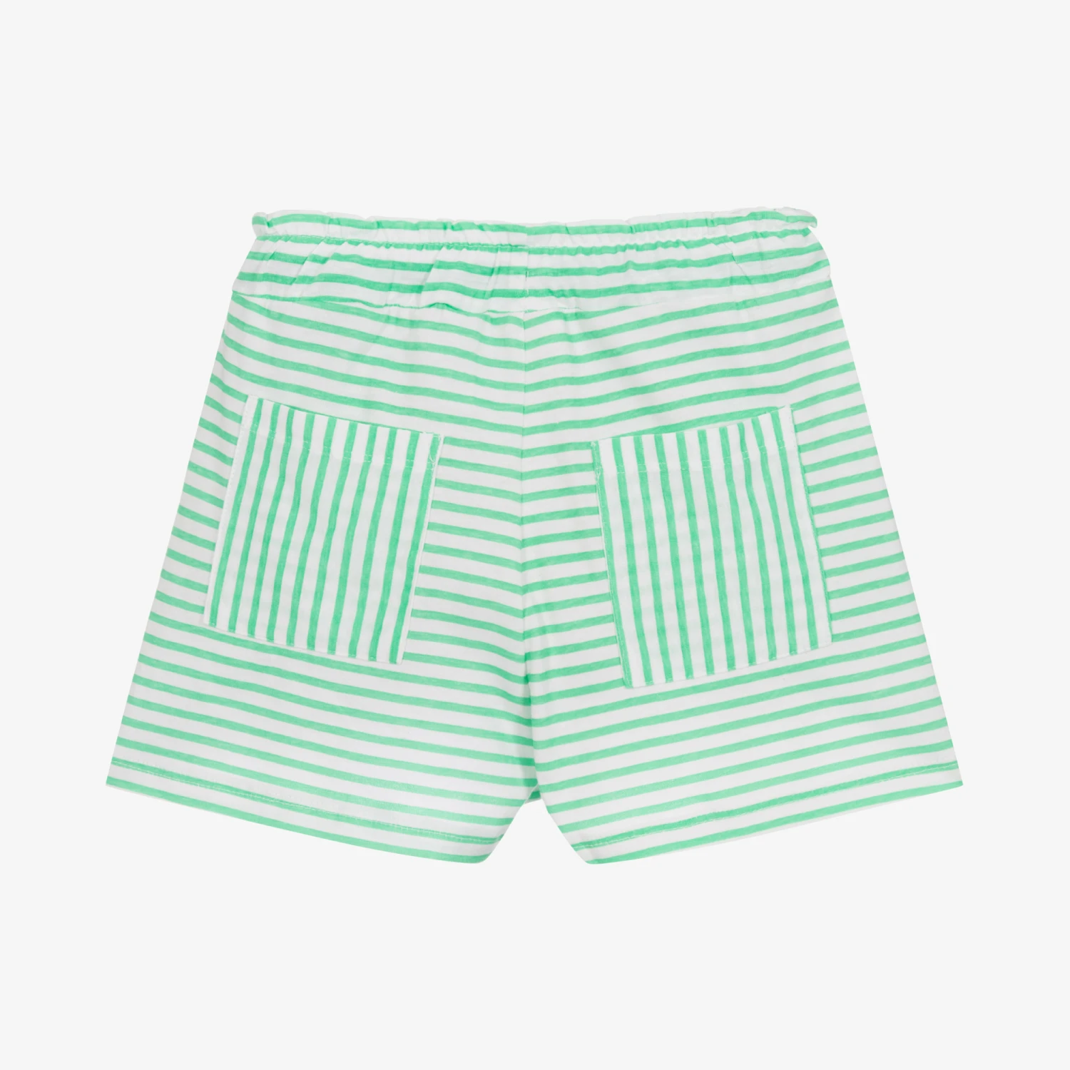 White and green striped shorts for girls by iDO Baby, made in a super soft cotton jersey. Easy-to-wear, these shorts have an elasticated waistband, with a functional drawstring ribbon to ensure a comfortable fit. They have two front pockets and two back pockets for a casual finish.