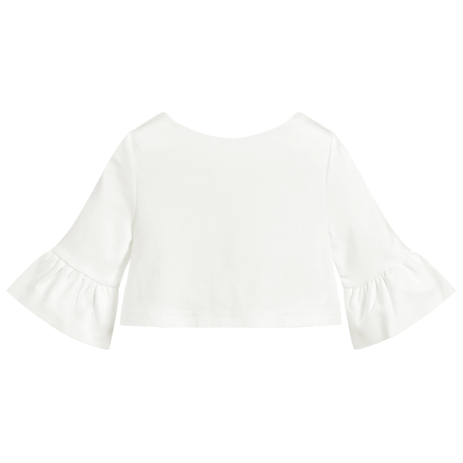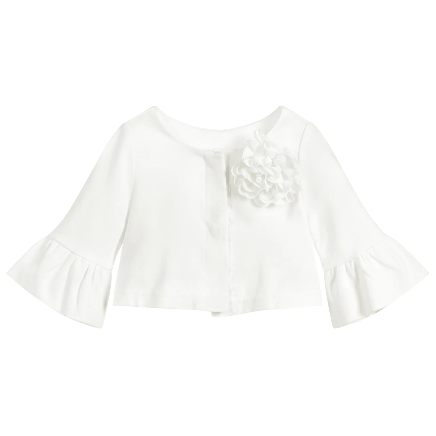 This adorable ivory swing cardigan by iDO has a pretty floral corsage and ruffled bell sleeves. Made in a fine stretchy jersey, it fastens with poppers on the front.