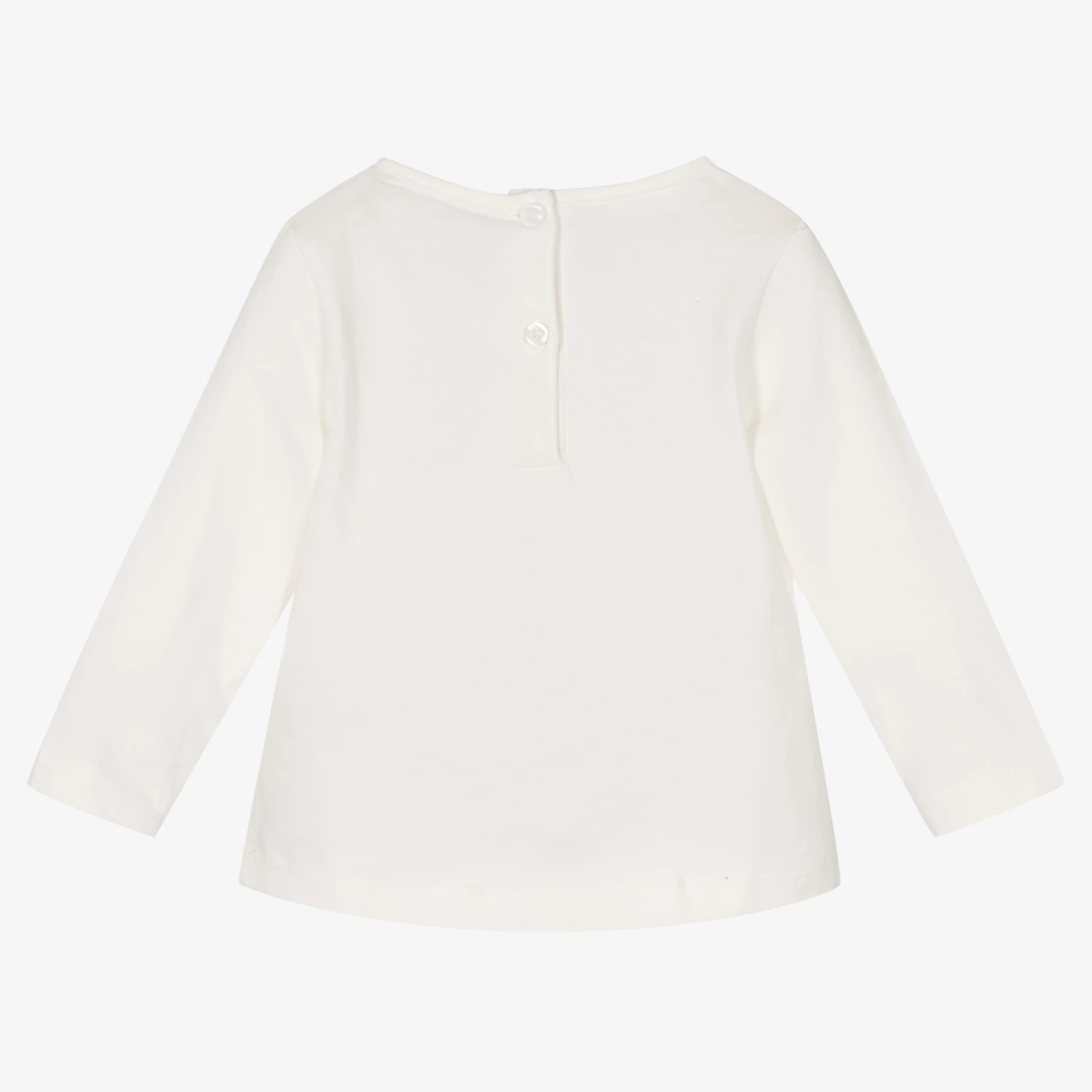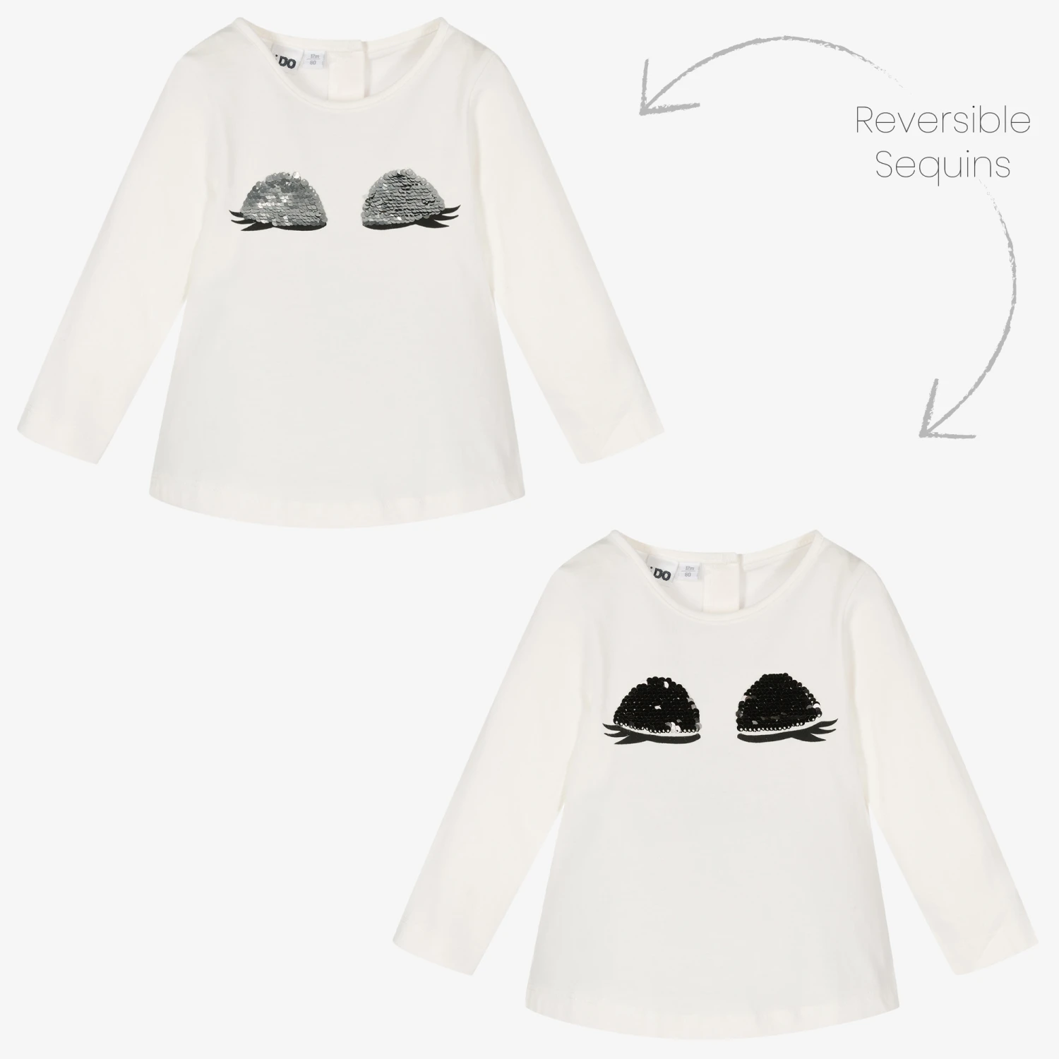 Pale ivory long-sleeved top for girls by iDO Baby, made in soft and comfortable cotton jersey. On the front is a pair of reversible sequin eyes in shiny silver and black, with black printed lashes. It fastens with buttons on the back.