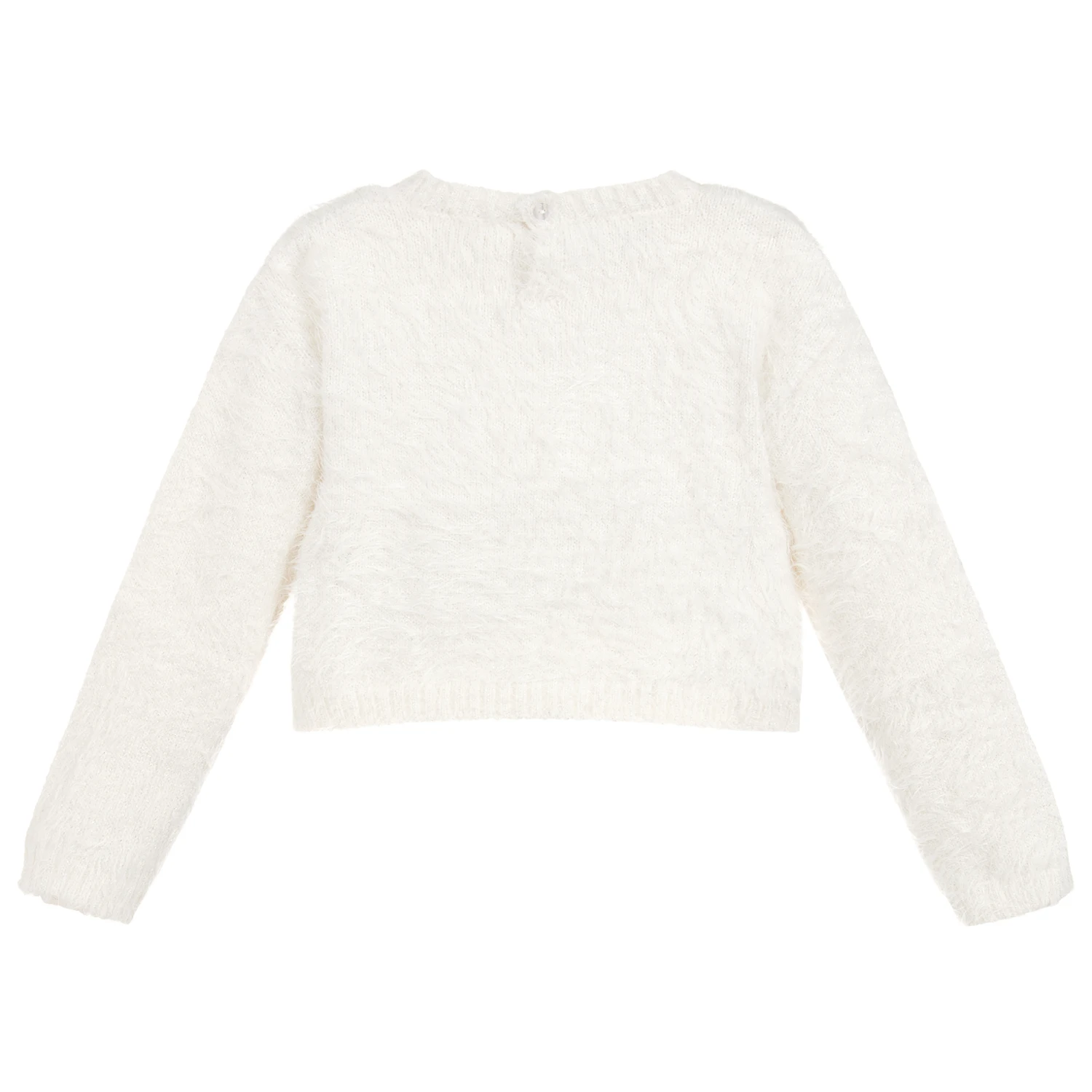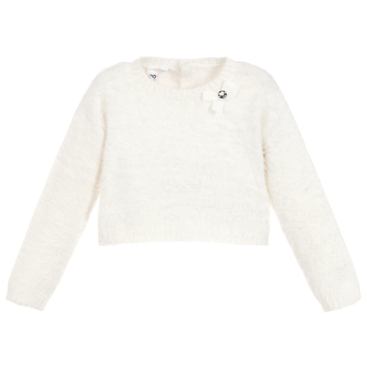 An ivory fluffy knitted sweater with a sparkly silver thread, for younger girls by iDO Baby. It has a velvet bow on the front and a button fastening on the back.