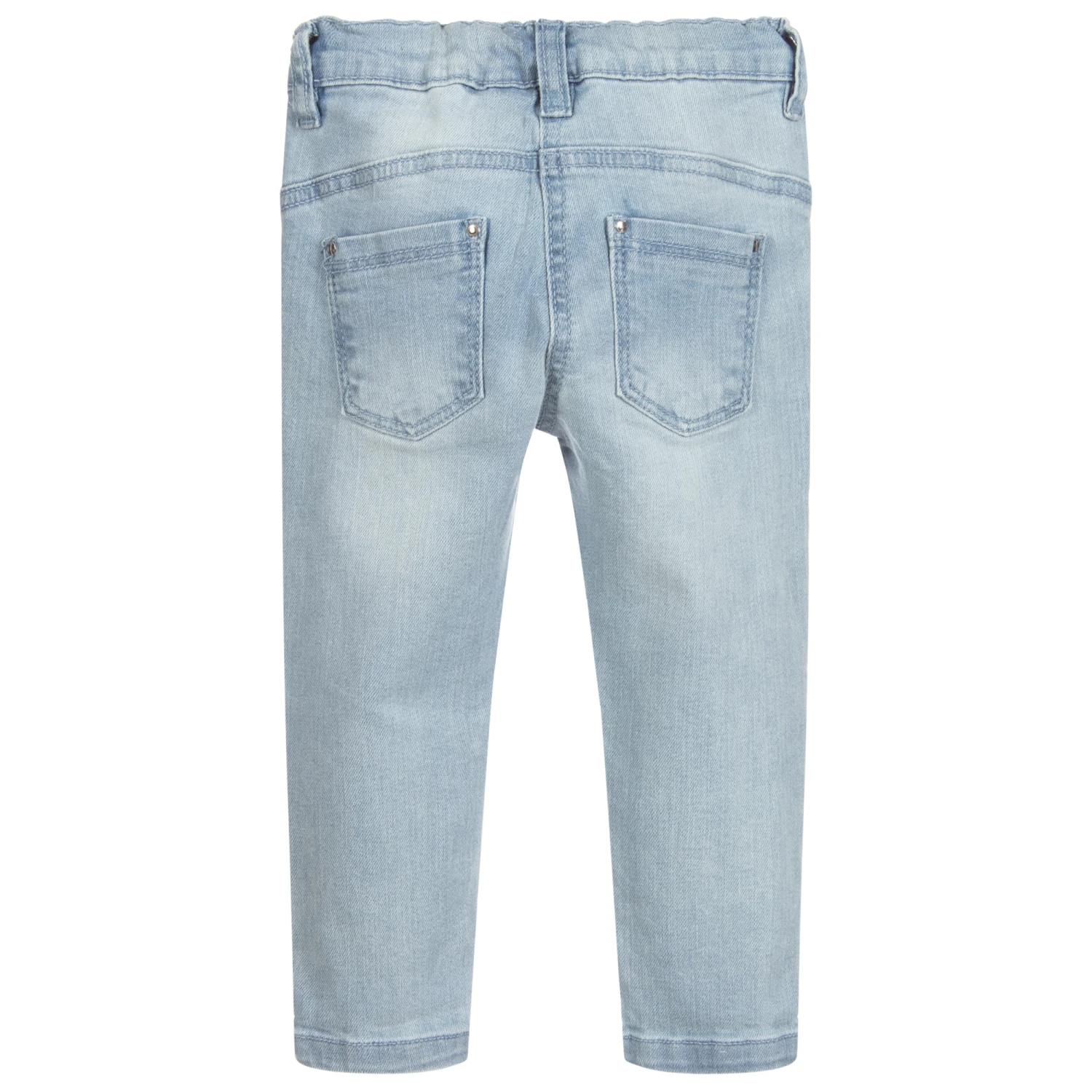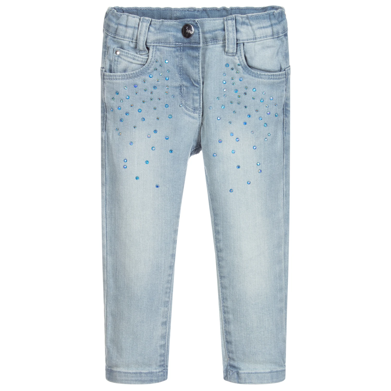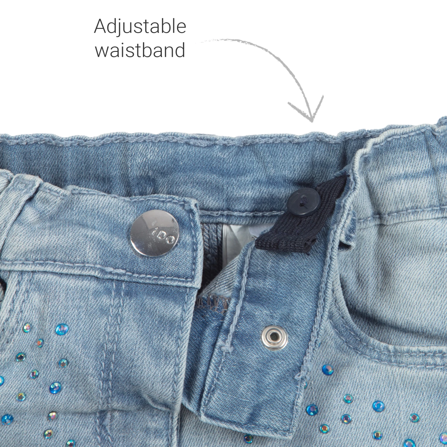 Light blue slim fit jeans for younger girls by iDO Baby, made in soft stretch denim with a faded look and blue diamanté trims. They have a useful adjustable waist and fasten with a hook.