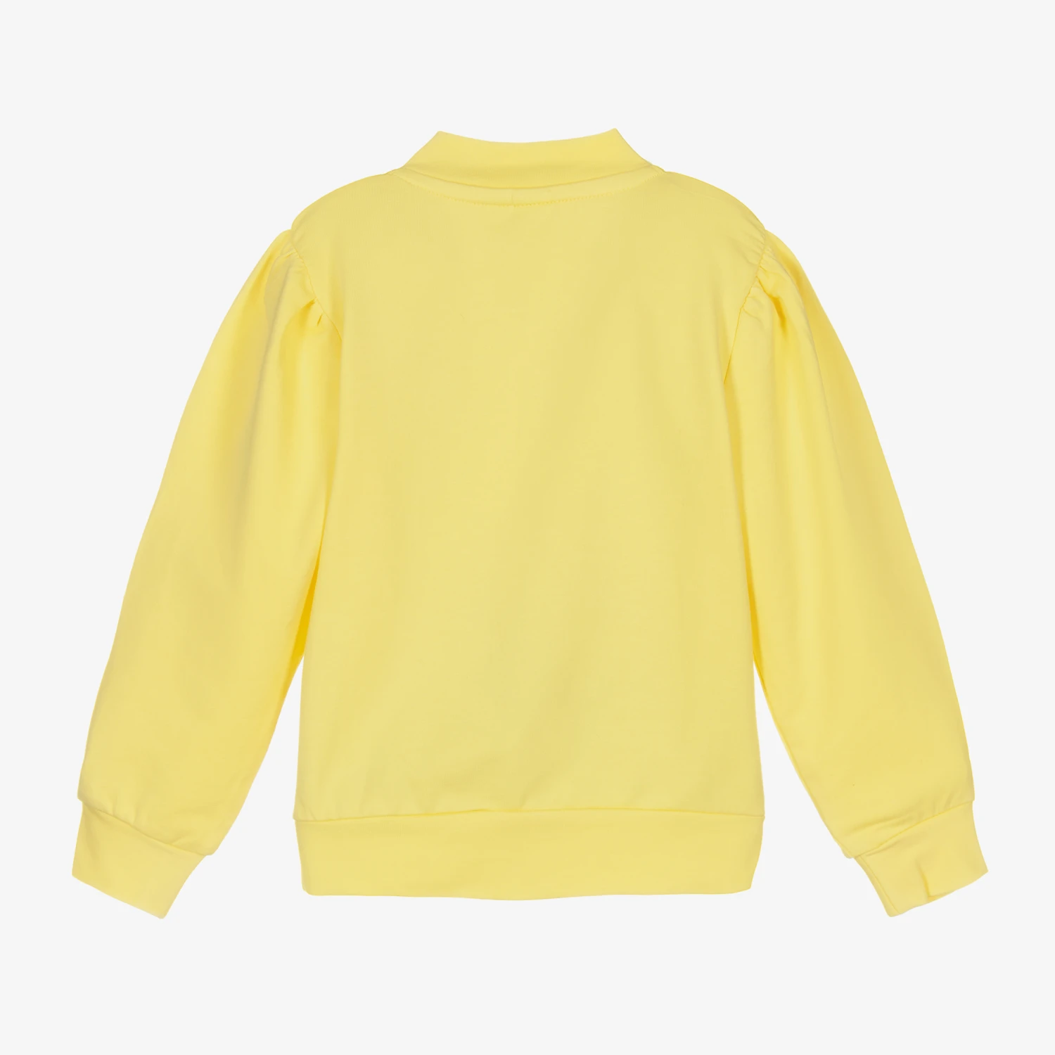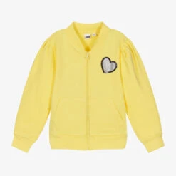 Girls yellow cotton zip-up top by iDO Baby. Made in soft jersey, this bright and cheerful top has a silver and black sequin heart appliqué, front pouch pockets and puffed shoulders.