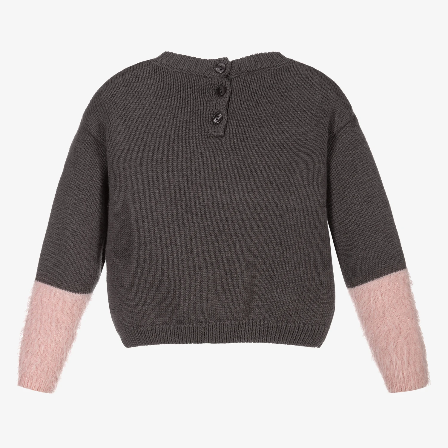 Super soft grey knitted sweater for girls by iDO Baby, made in a cotton and wool blend yarn. It is patterned with fluffy, sparkly pink stars on the front, with matching trim on the sleeves. There are button fastenings on the back.