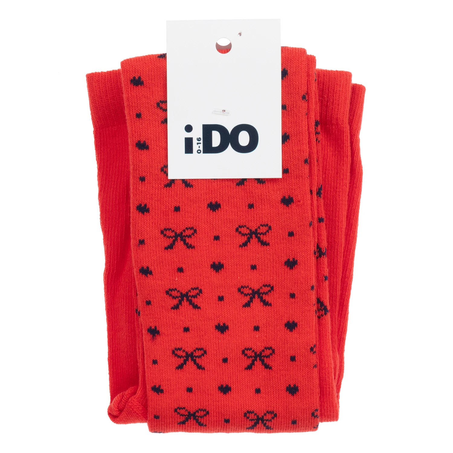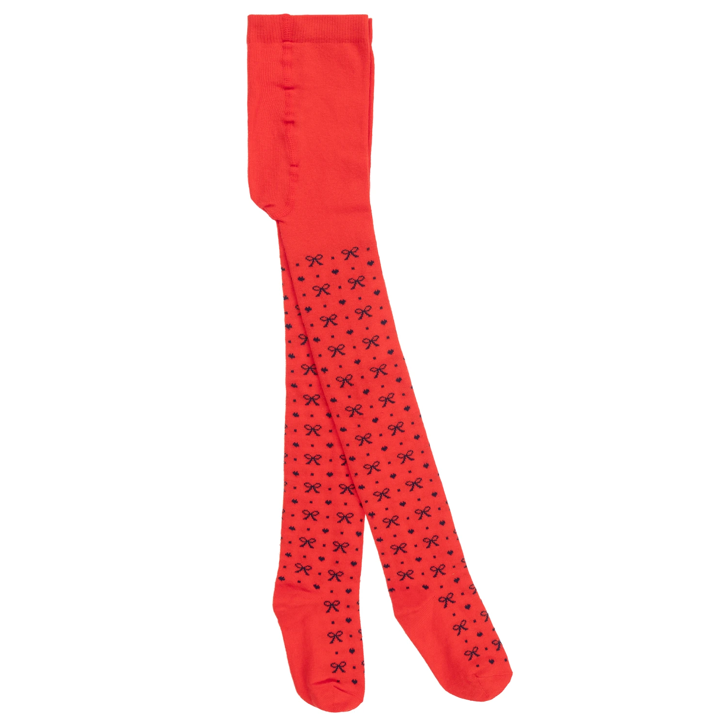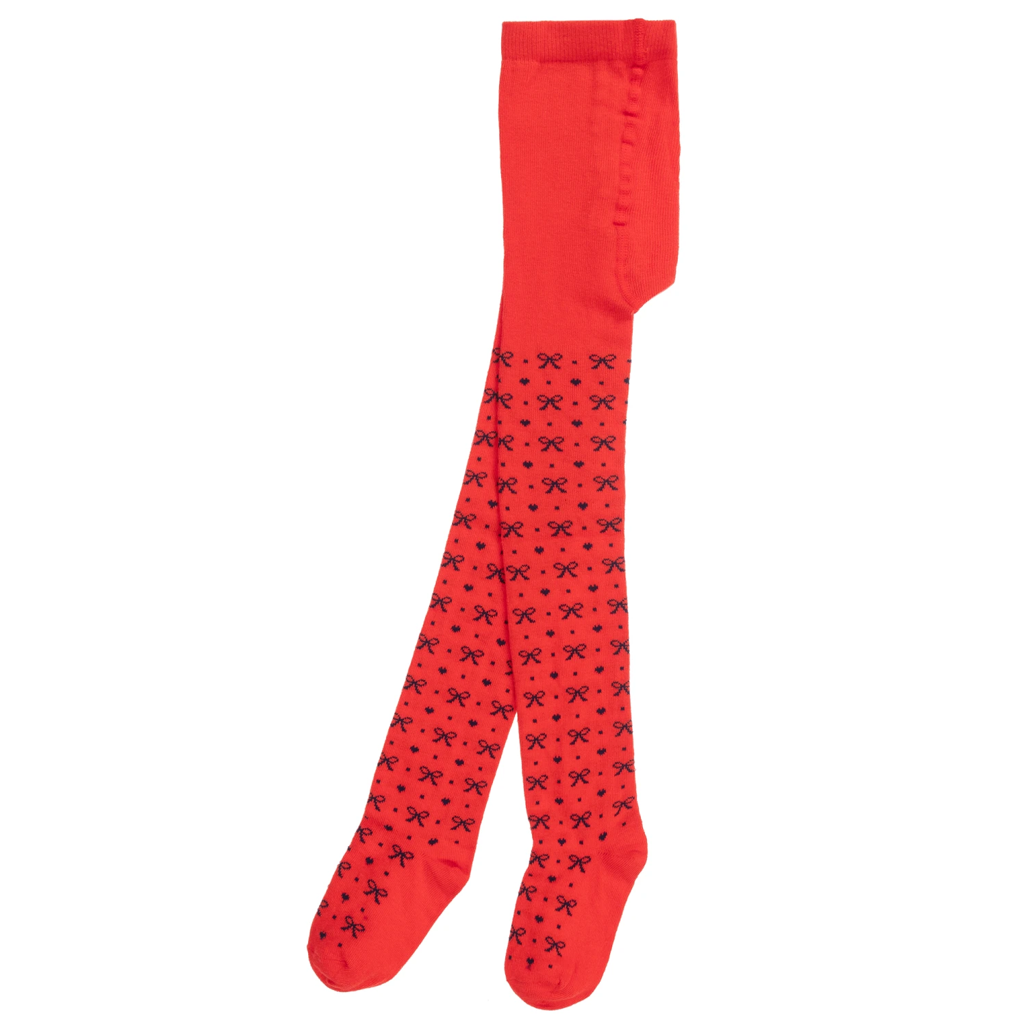 Red cotton tights for little girls by iDO Baby. Soft and stretchy, they are patterned with pretty navy blue bows, hearts and dots.