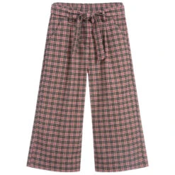 Girls wide leg trousers by iDO Junior in a smart beige, pink and black check. Ankle length, they are made in a soft viscose blend fabric, with pleats on the front and slanted pockets. There is a fixed tie belt on the adjustable waist and they fasten with a zip and button.
