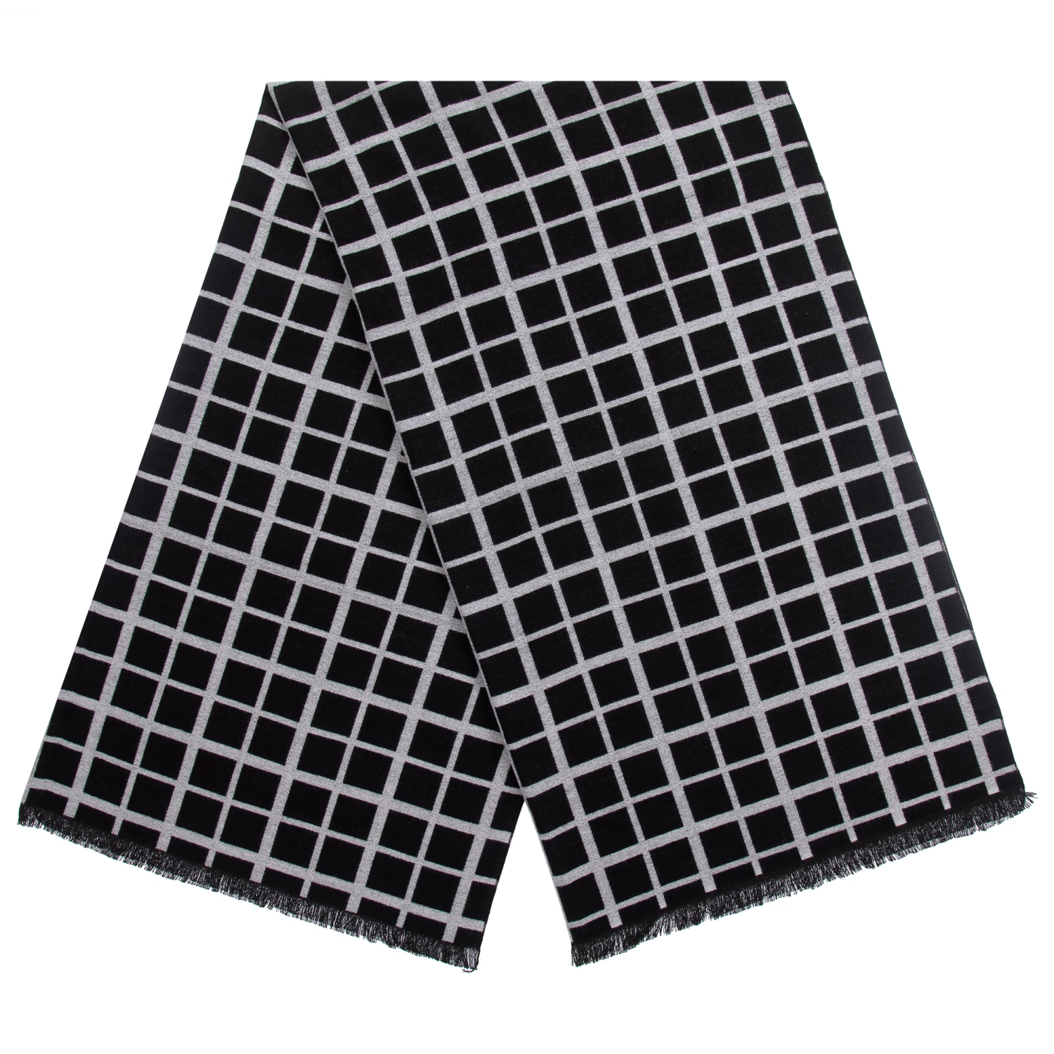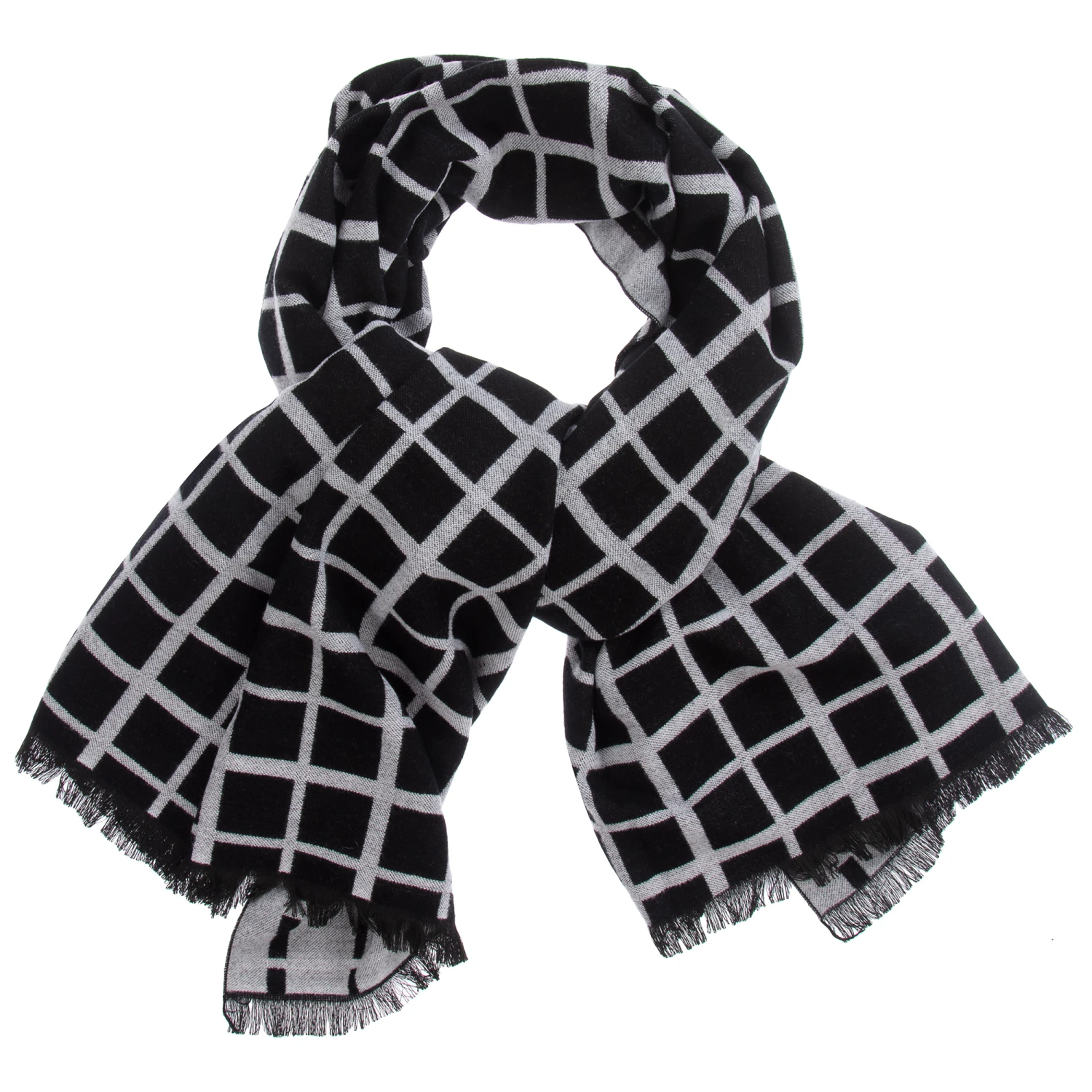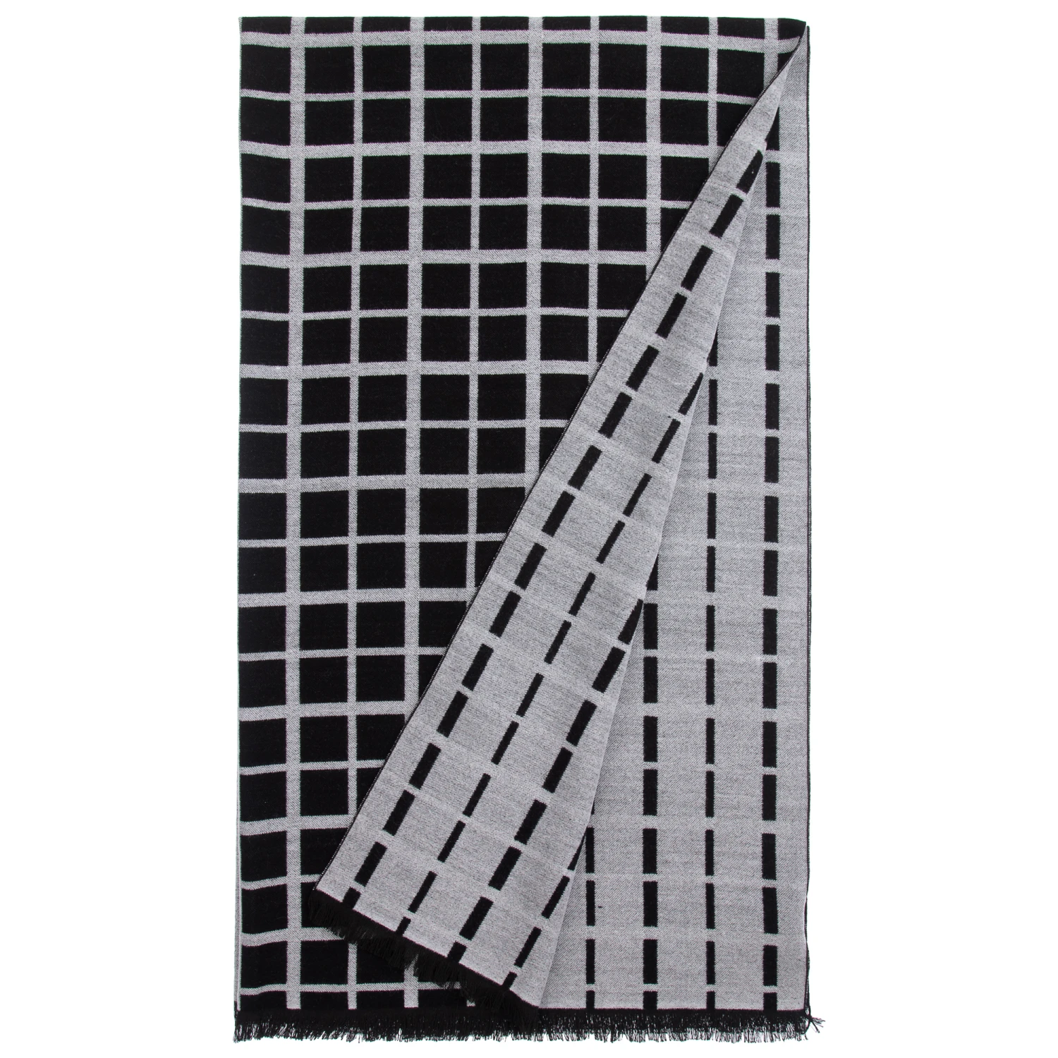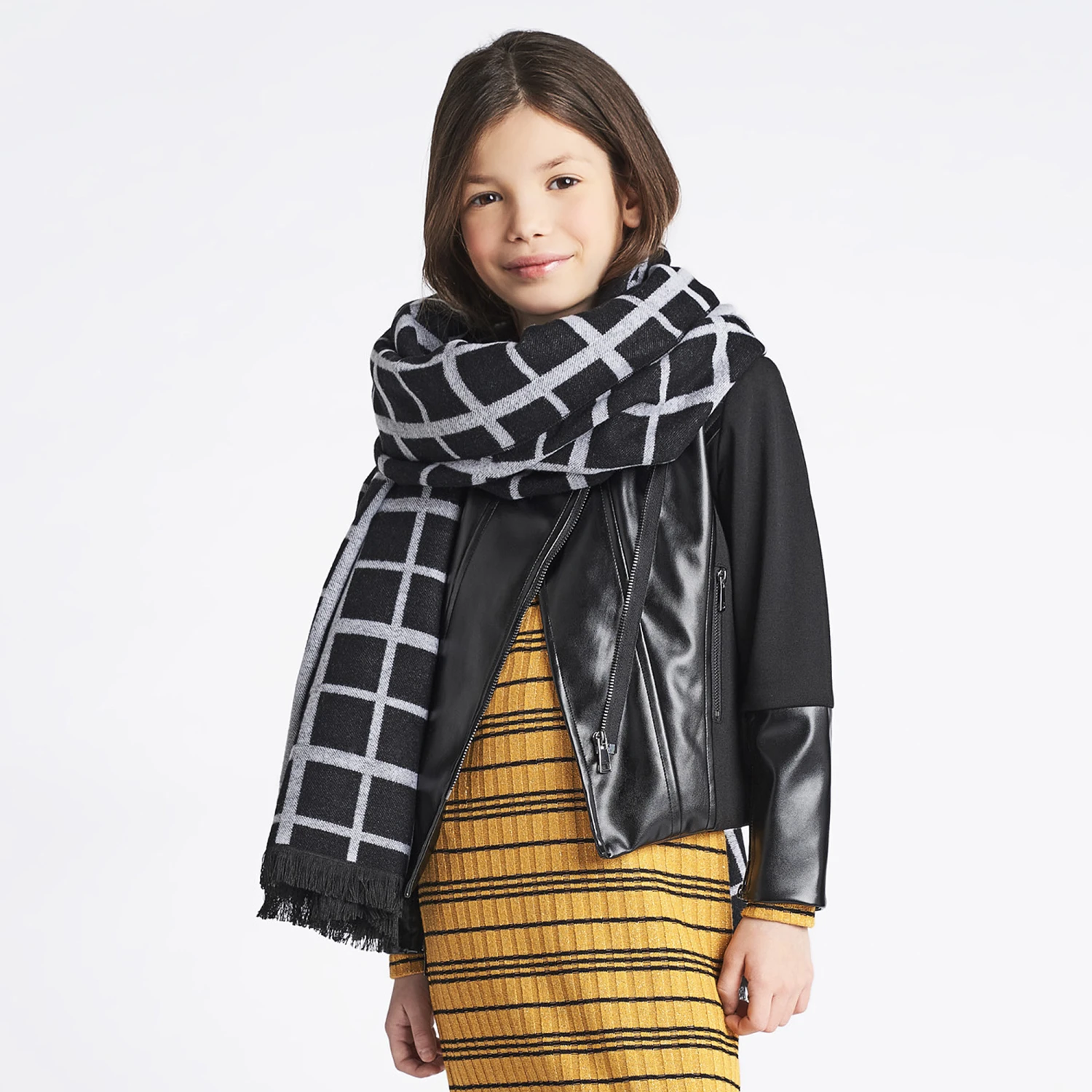 A super soft and warm scarf for girls by iDO Junior. One side has a black and grey checked pattern. The other side is grey with short back stripes.