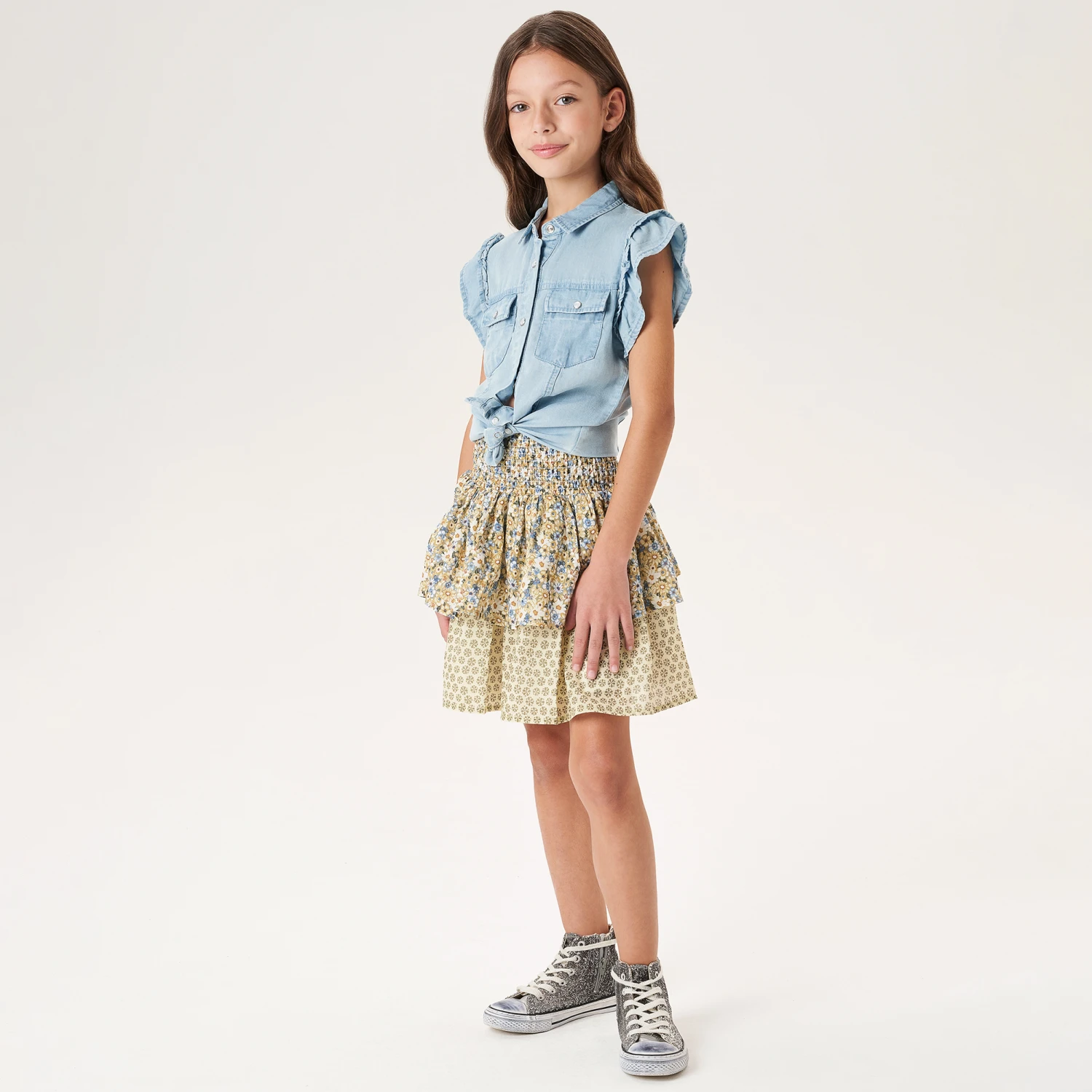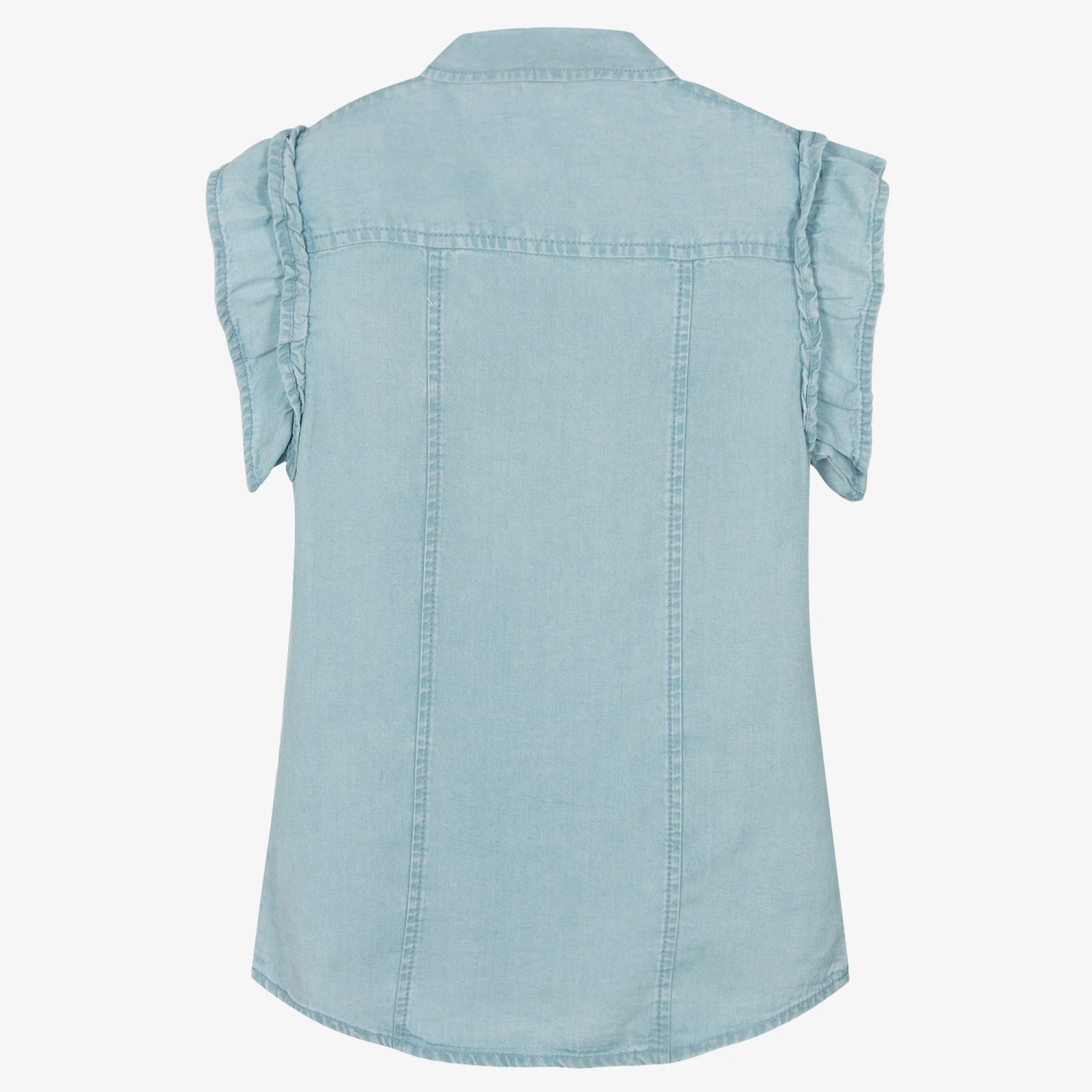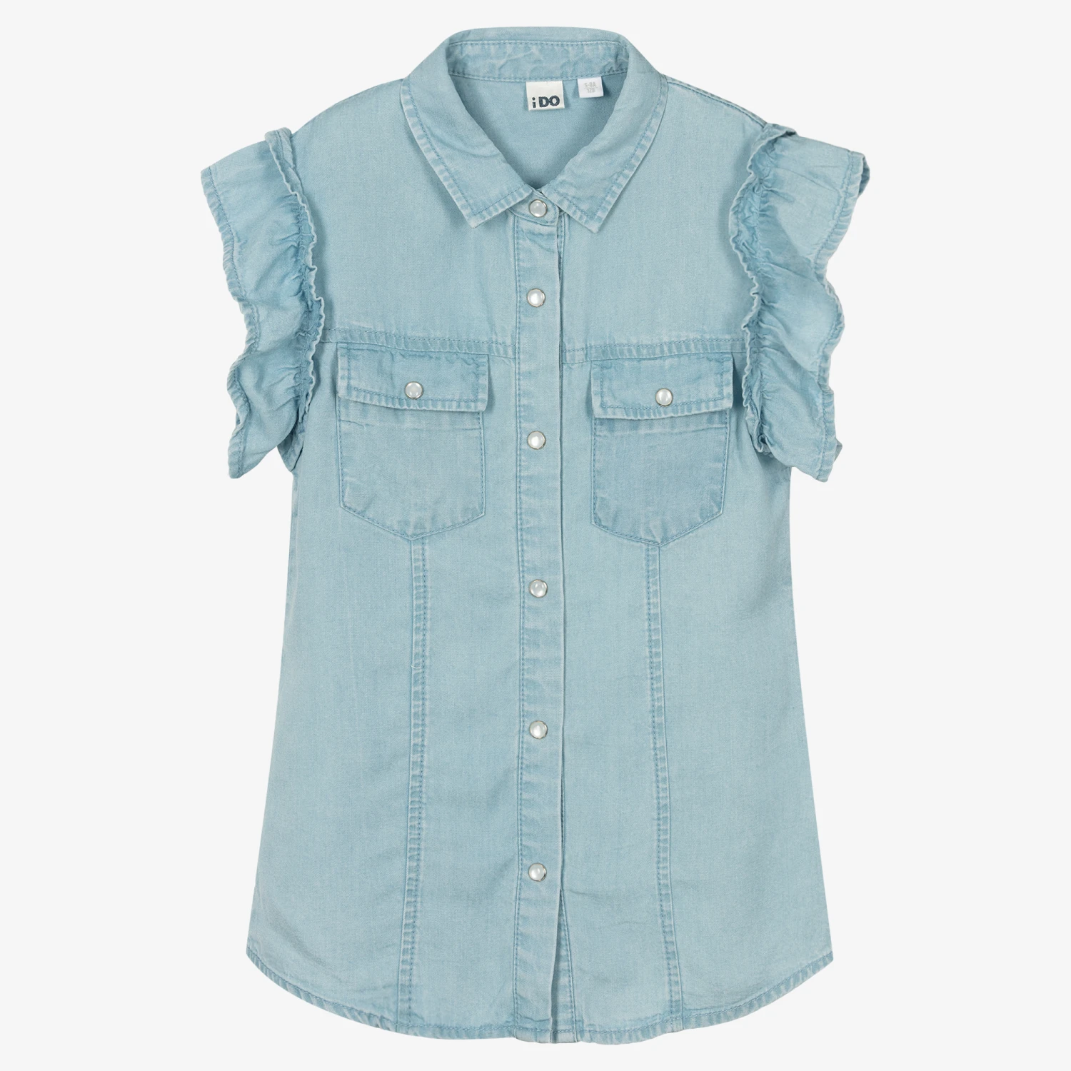 Light blue short-sleeved shirt for girls by Italian brand iDO Junior, made in super soft lyocell chambray. Simple and contemporary, it has pearlescent popper fastenings, front pockets, and ruffled sleeves.