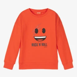 Girls orange-red cotton jersey sweatshirt by iDO Junior, featuring a black and red smiley face Emoji® print with a shimmery red lightning bolt.
