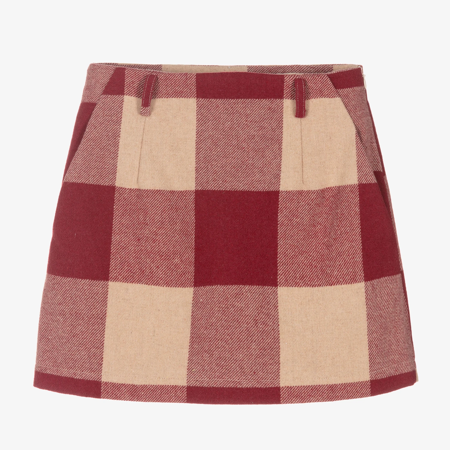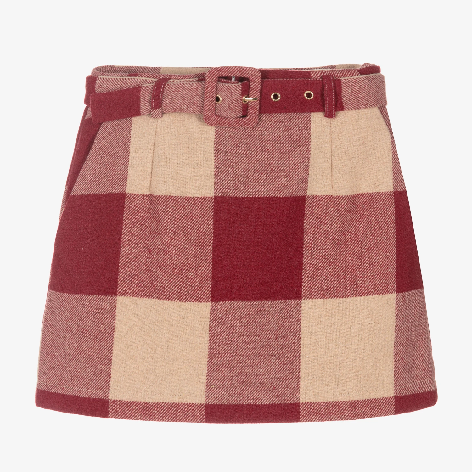 Red and beige check skirt for girls by iDO Junior, made in soft brushed flannel. There is a detachable belt and slanted front pockets. It fastens with a concealed side zip and is lined in soft and lightweight twill.