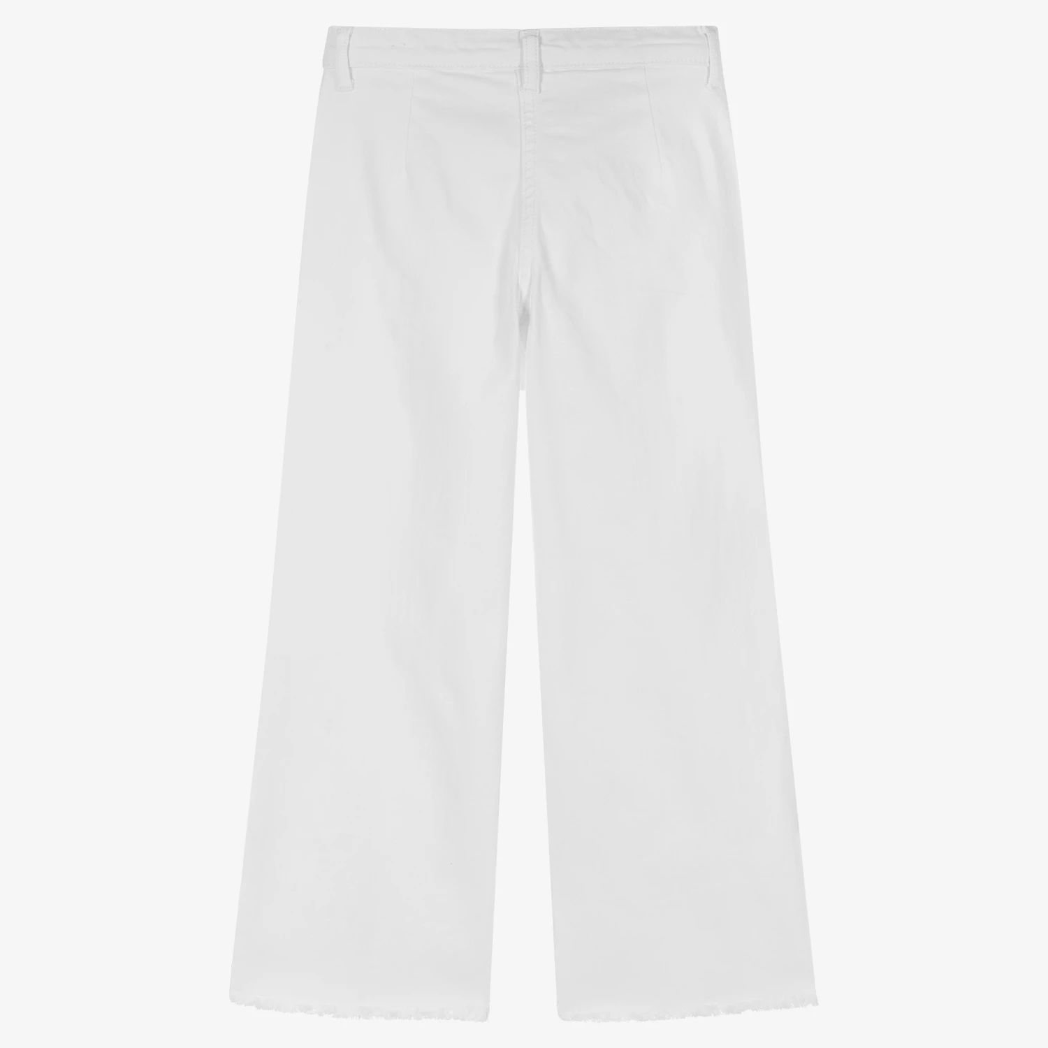 White denim jeans for girls from Italian brand iDO Junior, made in soft denim with slight stretch. These on-trend wide-leg trousers have a flattering high waistline, adjustable for a comfortable fit. Darted on the back for shape, they are designed with useful front pockets, a shiny silver front button fastening and cool fringing on the hem for a boho look.