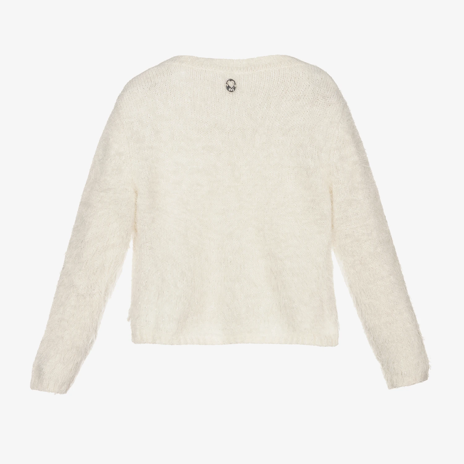 Beautifully soft with a touch of sparkle, an ivory fluffy knit cardigan for girls by iDO Junior. It has branded button fastenings and a stepped hem.