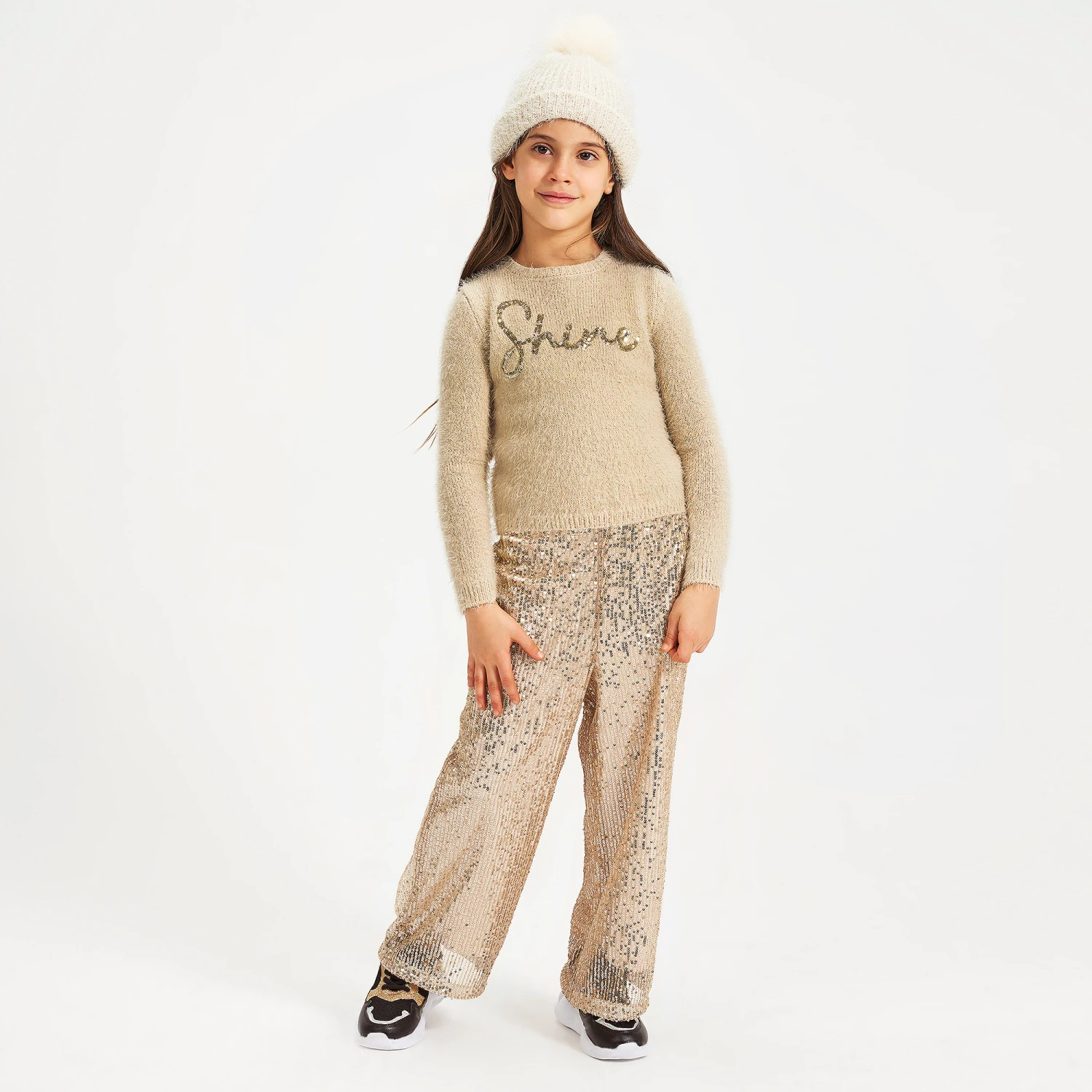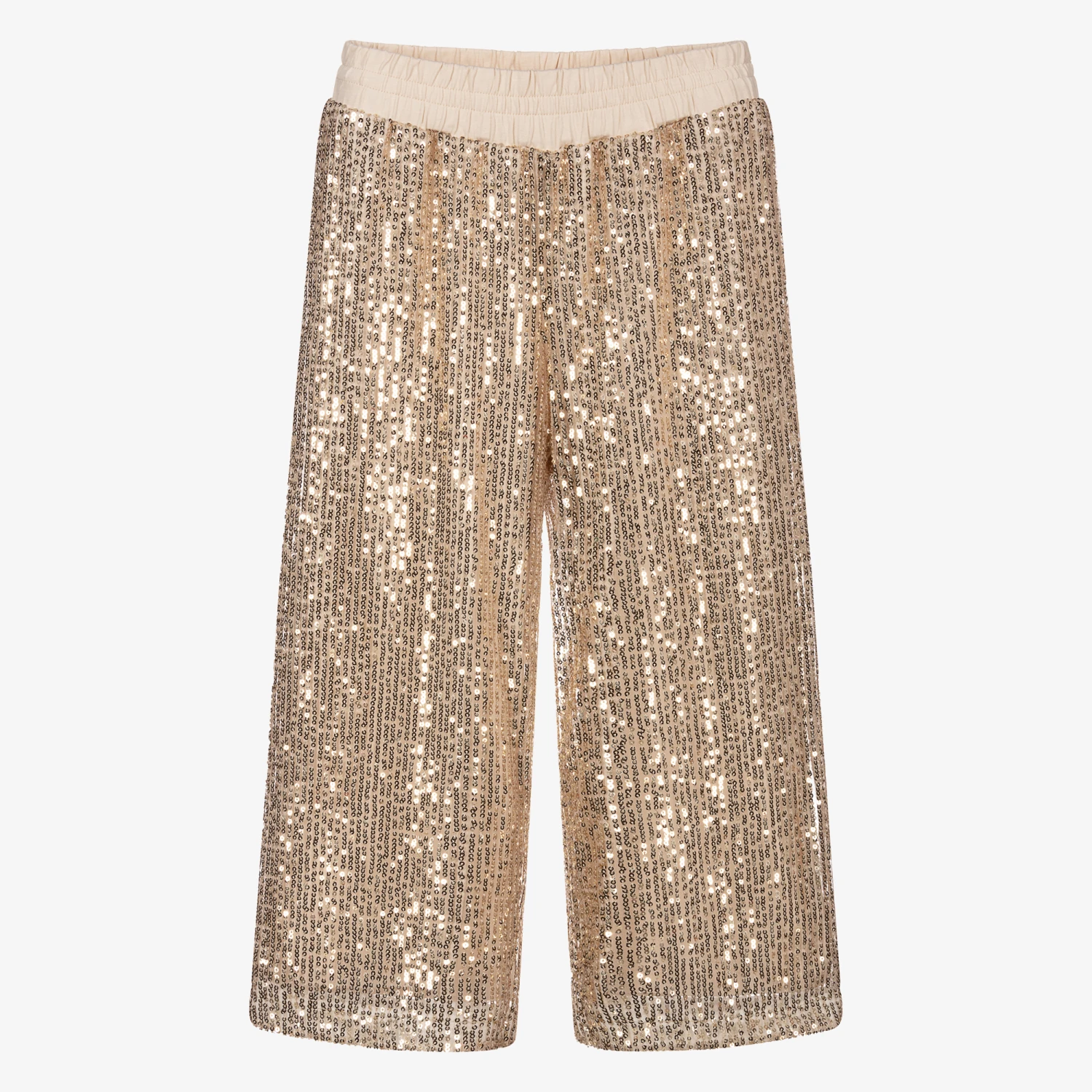 Ivory culottes for girls by iDO Junior. Lined with soft and stretchy cotton jersey, these striking trousers are made from tulle, decorated with gold sequins. They have an elasticated waist for comfort.