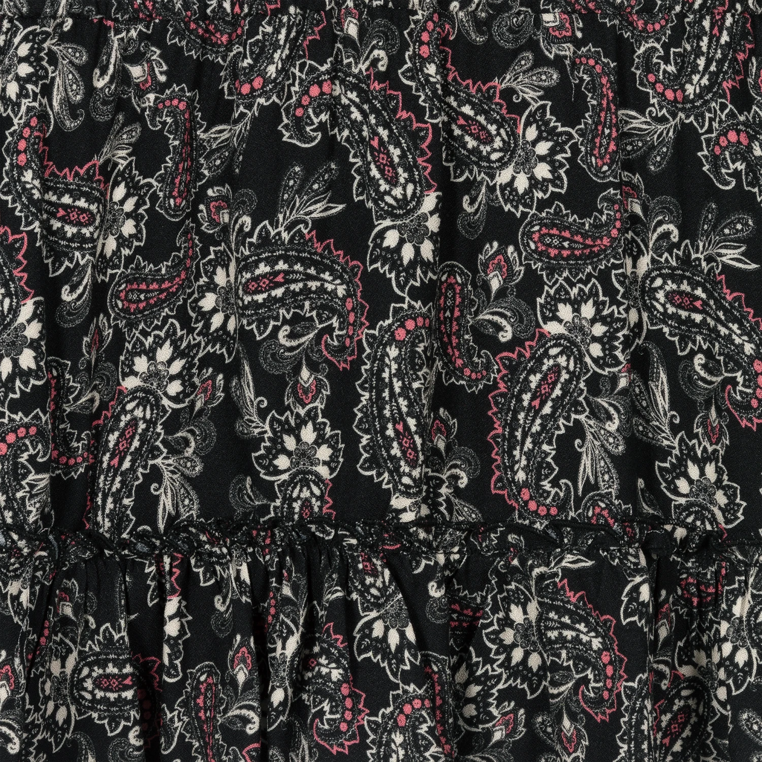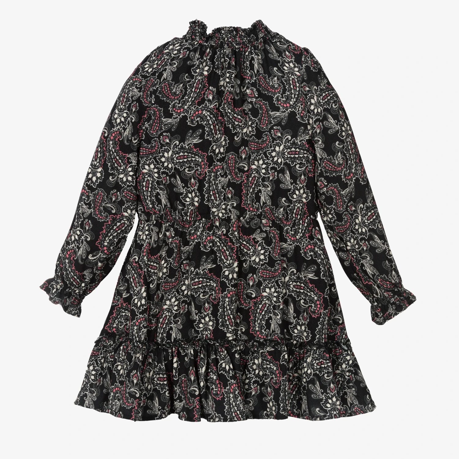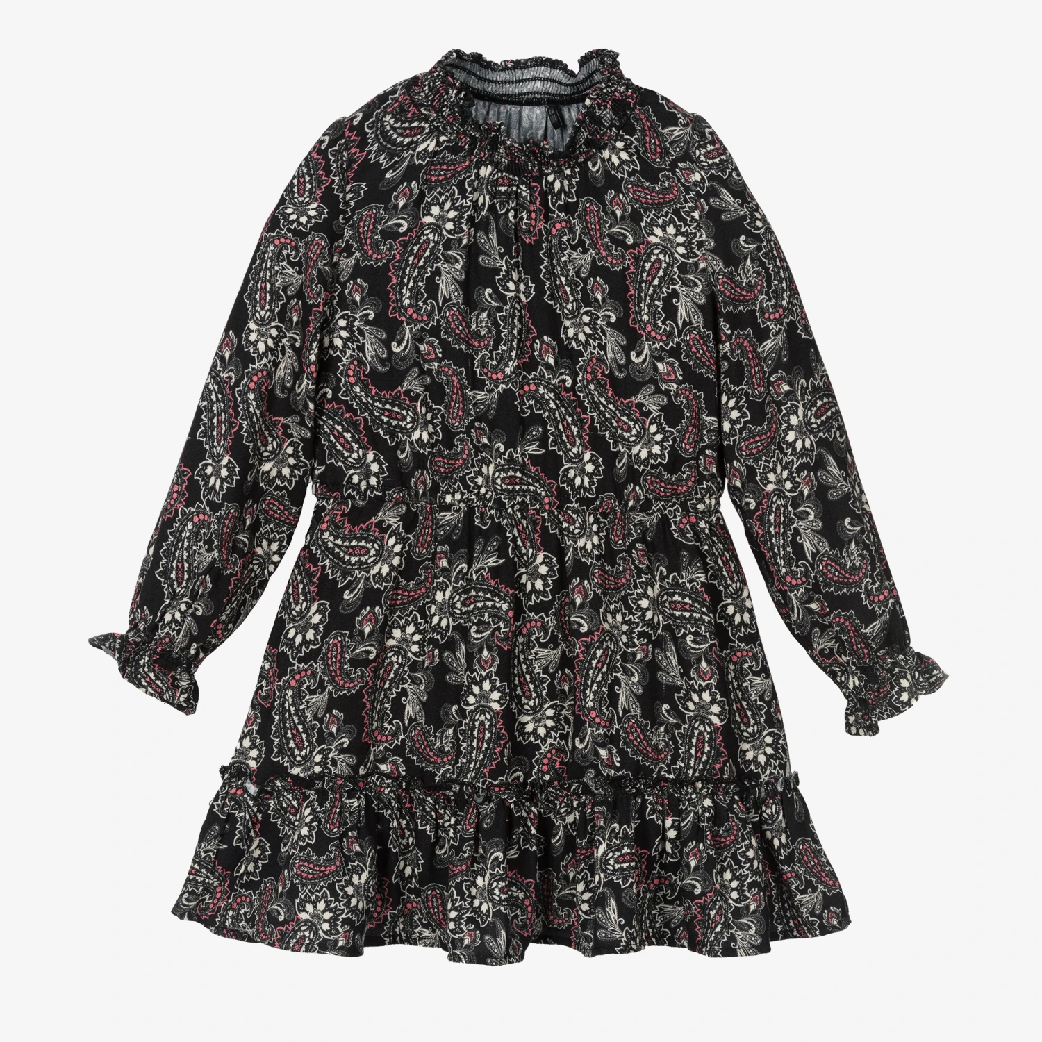 Pretty black dress for girls with a white and pink paisley print, by IKKS. Made in soft viscose crêpe, it is both smart and comfortable, with elasticated ruffles on the neckline and cuffs, and an elasticated waist. The lined skirt has a lovely ruffle hem and a there is a discreet logo tab on the side seam.