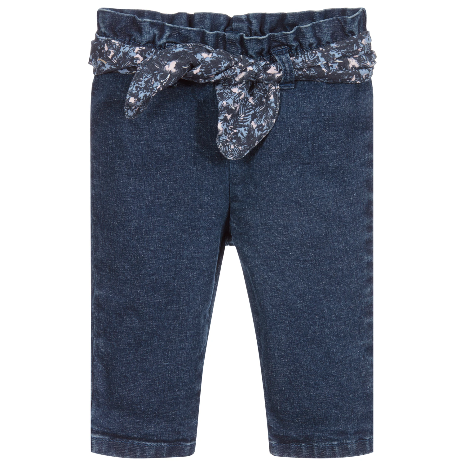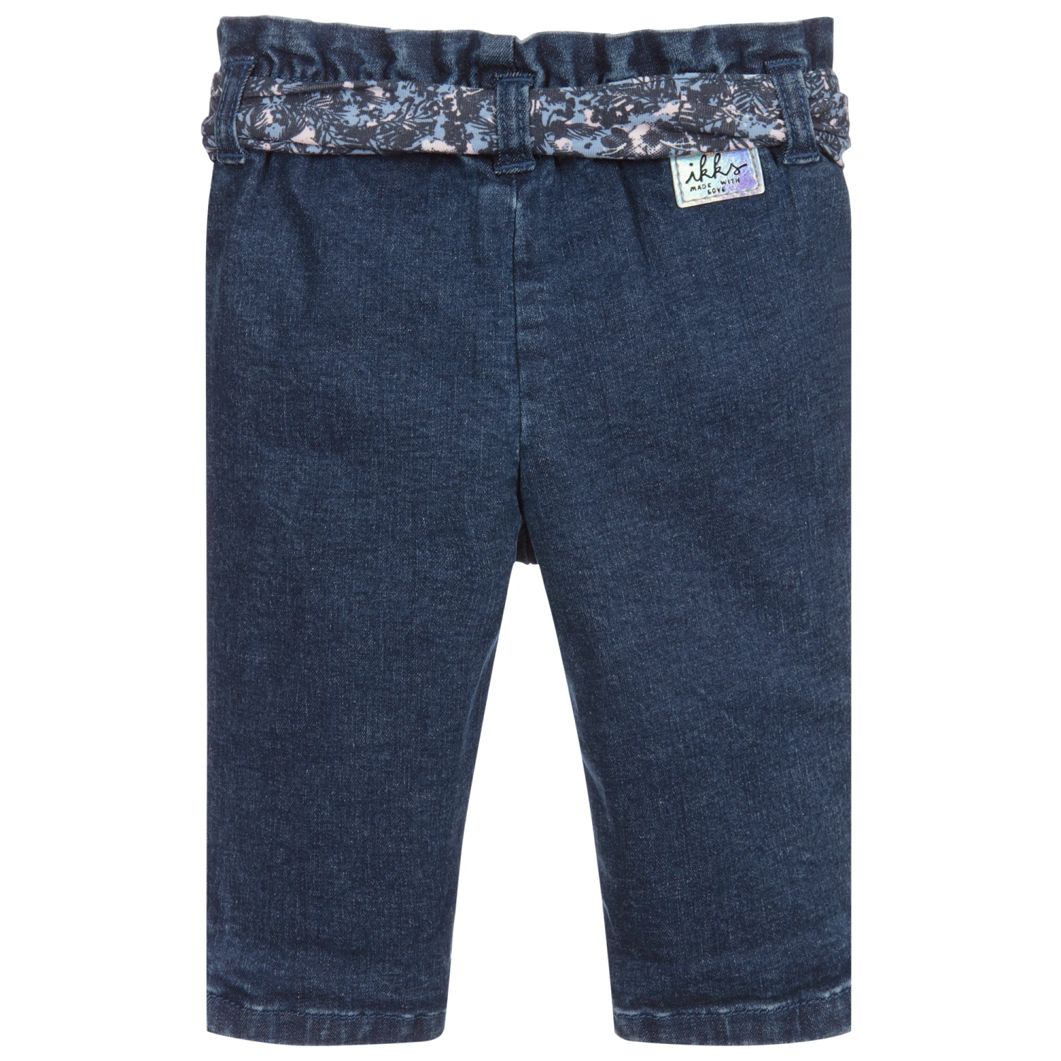 Dark blue jeans for little girls by IKKS. They are made in soft stretch denim, with a comfortable elasticated waist. They come with a detachable tie belt in pink and blue patterned jersey.