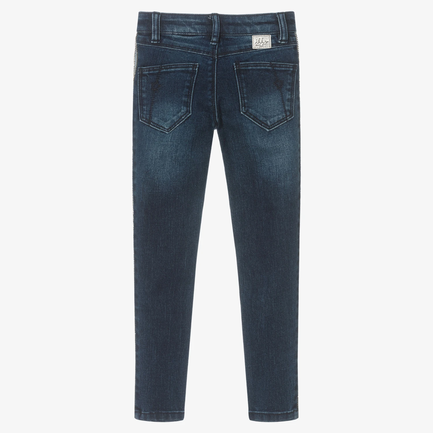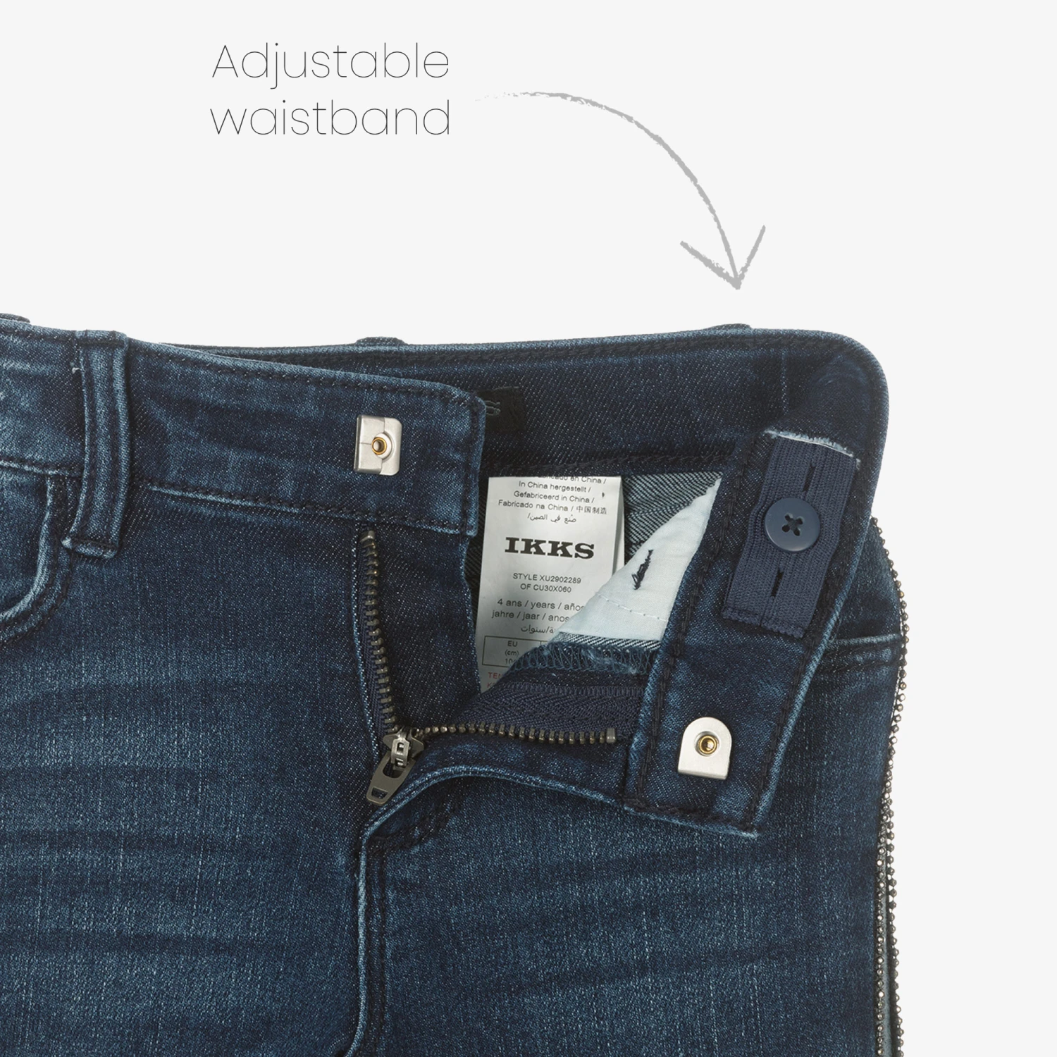 A gorgeous pair of dark blue denim jeans for girls by French brand IKKS, made in a soft and stretchy viscose blend. Balancing comfort and style, they have a front zip and hook fastening, classic four-pocket styling, and a useful adjustable waistband. They have interwoven taping with sparkly diamanté’s on the sides and a silver patch logo on the back.