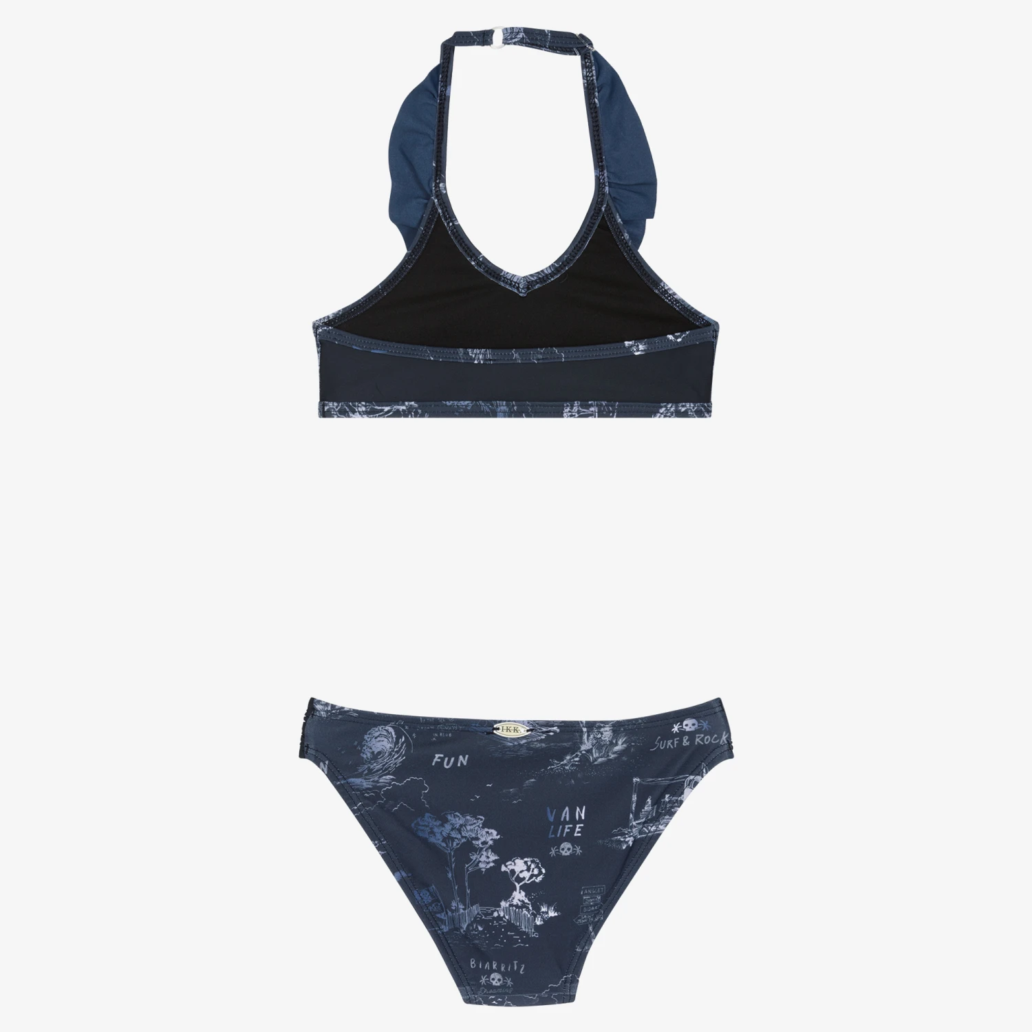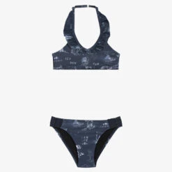 Navy blue bikini for girls by IKKS, with tonal surf and logo prints. Made with Econyl® regenerated materials, both pieces are silky smooth and stretchy, and are fully lined for comfort. The halter style top has pretty ruffle trim and an adjustable neck strap for a good fit, and the bottoms are beautifully finished with a surfboard-shaped charm logo on the back.