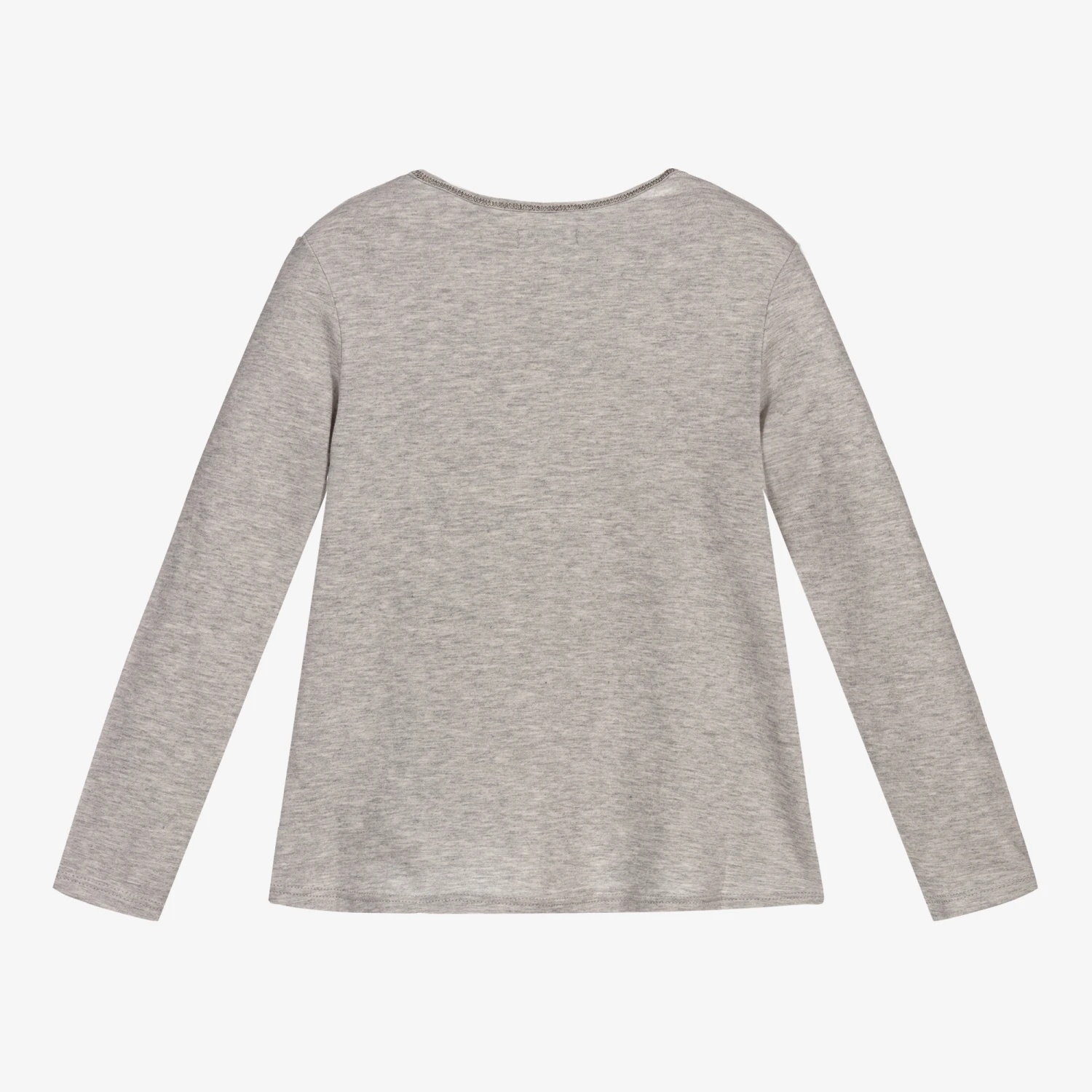 Grey marl top for little girls by IKKS, made in soft organic cotton jersey. It has a navy blue cat motif on the front, with sparkly trims.