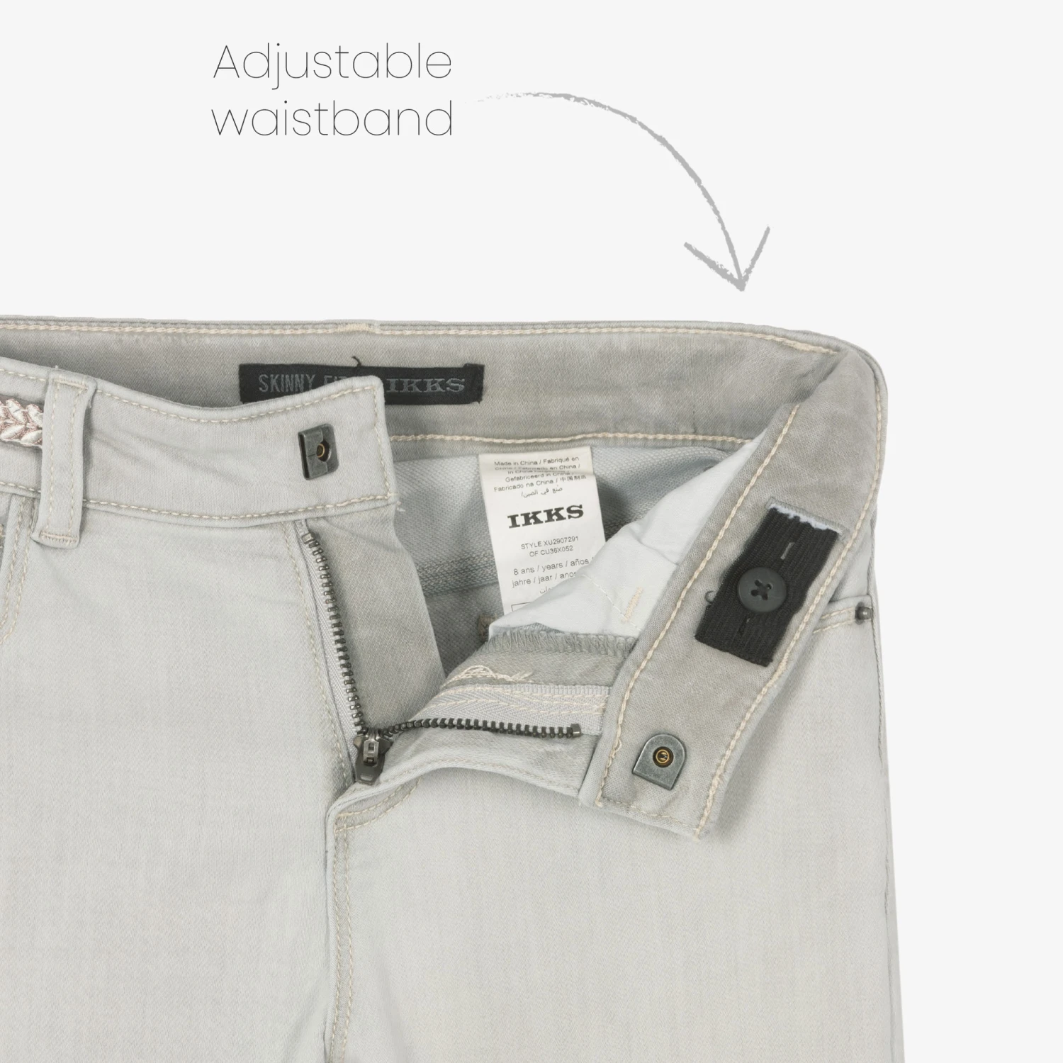 Light grey jeans for girls by French brand IKKS, made in a soft and stretchy cotton denim blend. These skinny fit jeans have an embroidered floral pattern around the waist, a zip and hook fastening and five-pocket styling. They have an adjustable waistband and a silver patch logo on the back.