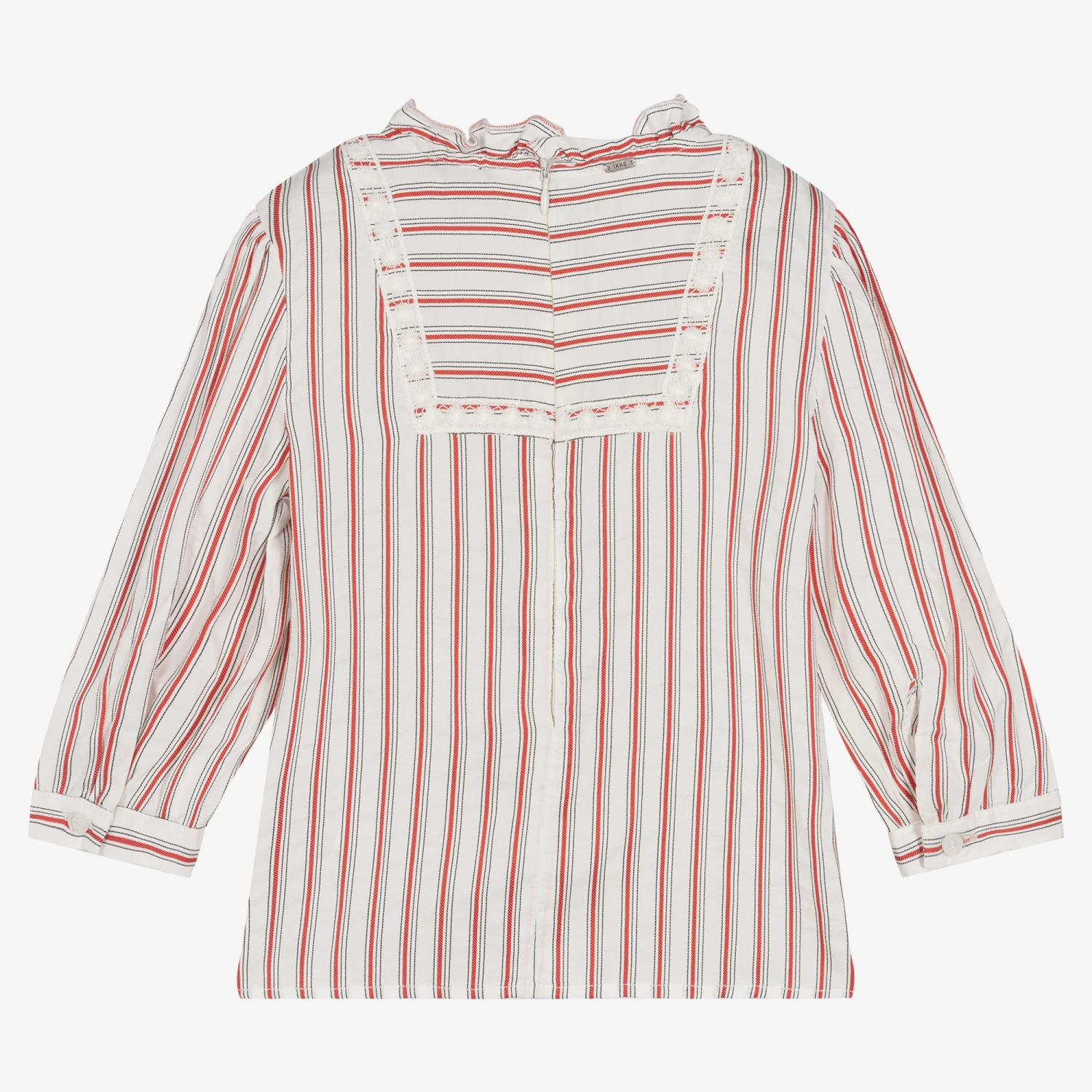 Ivory with a red and black stripe, this lovely blouse for girls is by IKKS. It has a ruffled high collar and pretty embroidered lace trims on the back and front. Easy and comfortable to wear, it is made in a lightweight viscose blend with a concealed zip on the back.